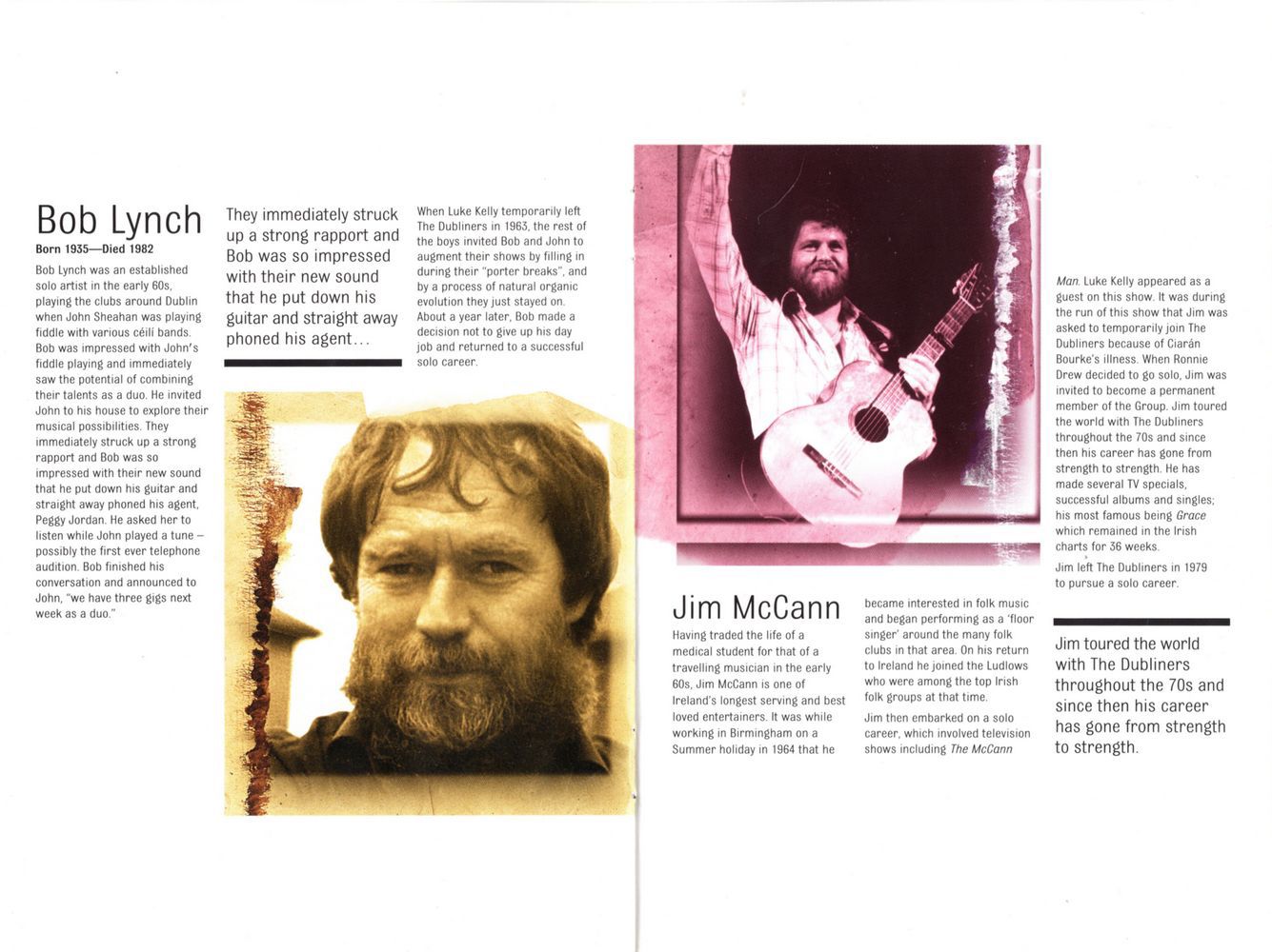 When Luke Kelly temporarily left The Dubliners in 1963, the rest of the boys invited Bob and John to augment their shows by filling in during their "porter breaks", and by a process of natural organic evolution they just stayed on. About a year later, Bob made a decision not to give up his day job and returned to a successful solo career.