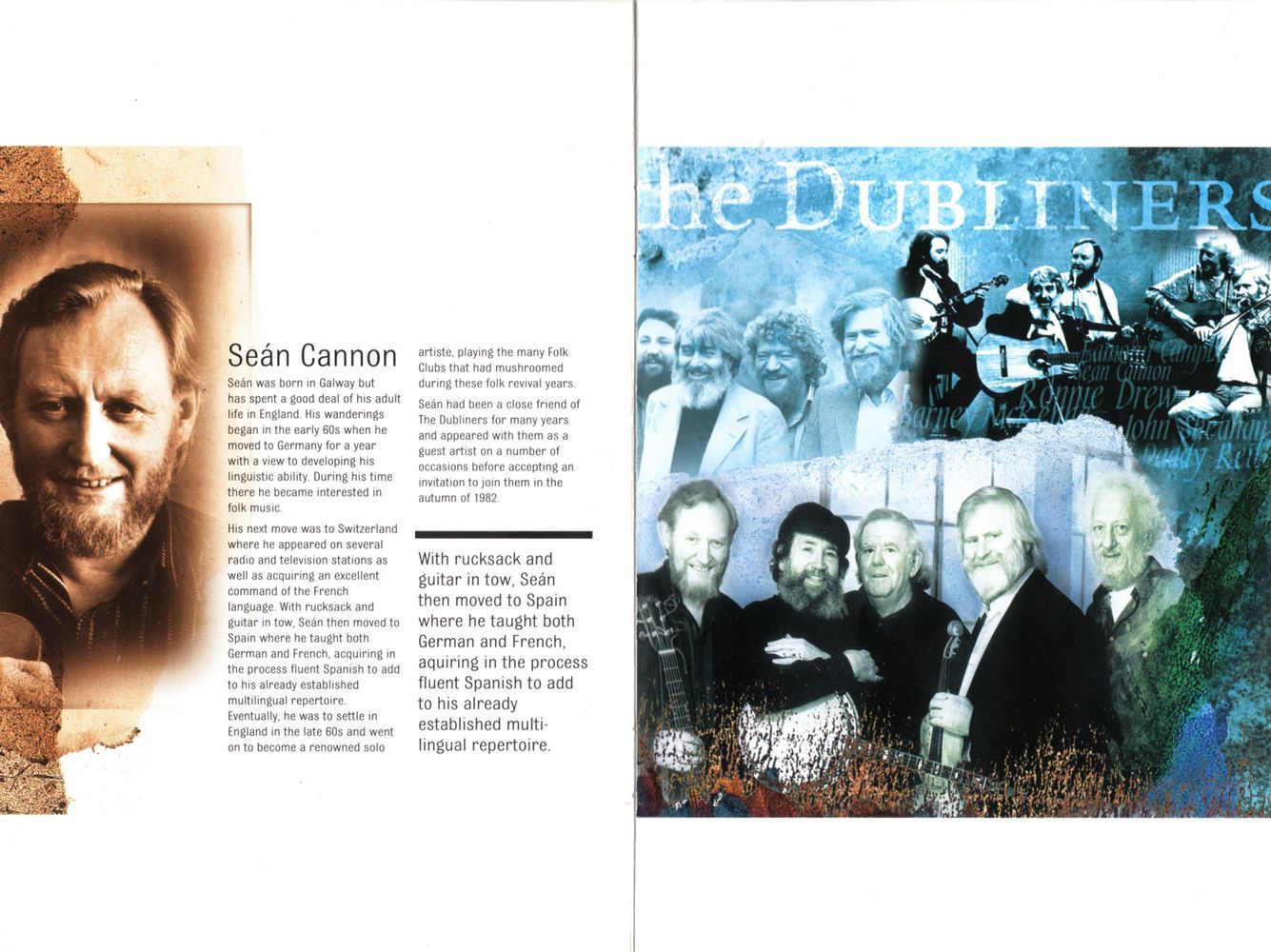 His next move was to Switzerland where he appeared on several radio and television stations as well as acquiring an excellent command of the French language. With rucksack and guitar in tow, Seán then moved to Spain where he taught both German and French, acquiring in the process fluent Spanish to add to his already established multilingual repertoire. Eventually, he was to settle in England in the late 60s and went on to become a renowned solo artiste, playing the many Folk Clubs that had mushroomed during these folk revival years.