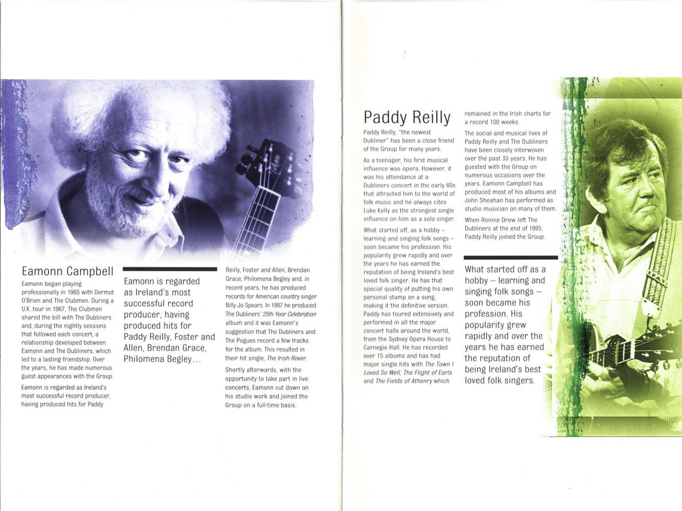 The social and musical lives of Paddy Reilly and The Dubliners have been closely interwoven over the past 35 years. He has guested with the Group on numerous occasions over the years. Eamonn Campbell has produced most of his albums and John Sheahan has performed as studio musician on many of them.