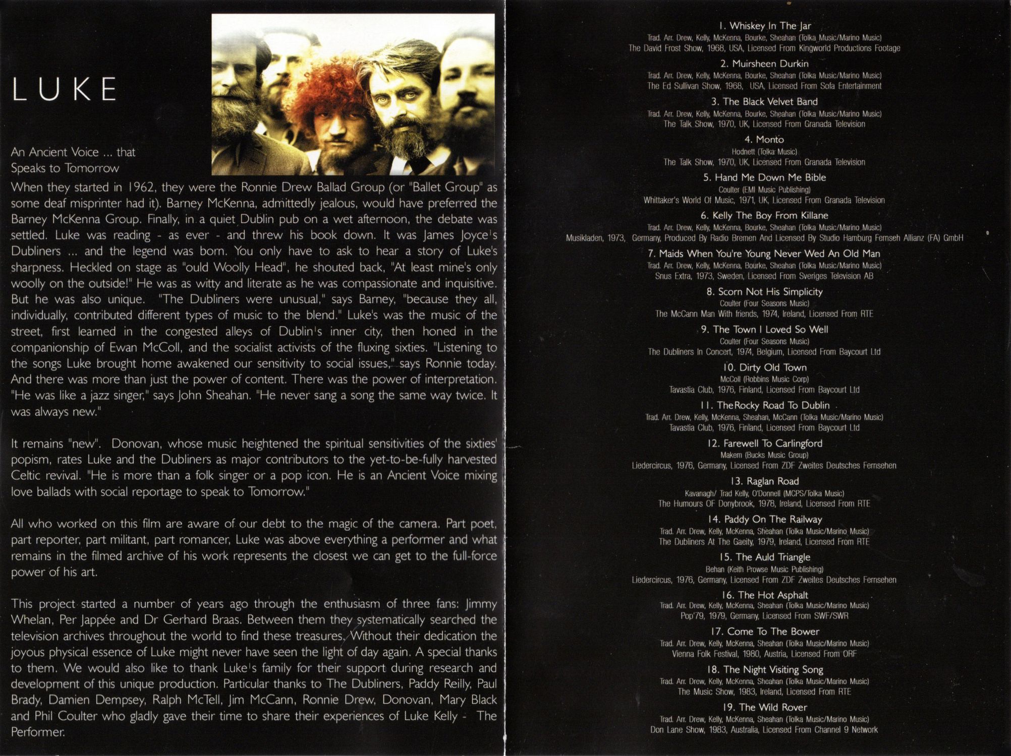 It remains "new". Donovan, whose music heightened the spiritual sensitivities of the sixties' popism, rates Luke and the Dubliners as major contributors to the yet-to-be-fully harvested Celtic revival. "He is more than a folk singer or a pop icon. He is ah Ancient Voice mixing love ballads with social reportage to speak to Tomorrow".