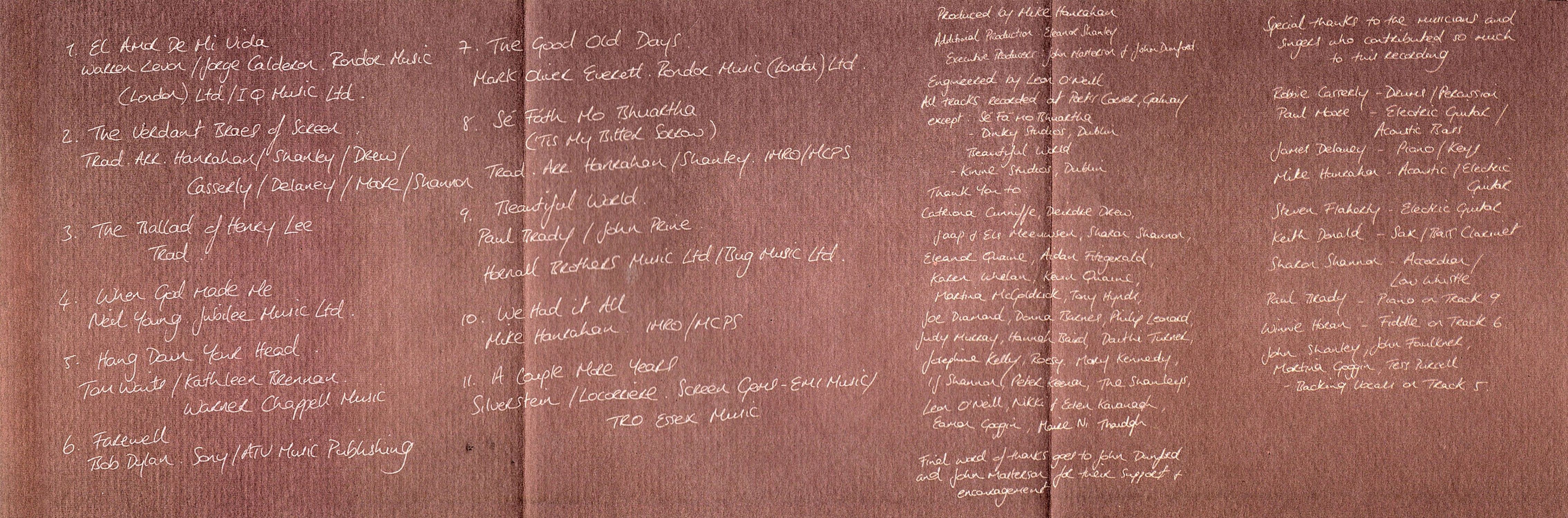Thank You to: Catriona Cunniffe, Deirdre Drew, Jaap & Els Meeuwsen, Sharon Shannon, Eleanor Quaine, Aldan Fitzgerald, Karen Whelan, Kevin Quaine, Martina McGoldrick, Tony Hynds, Joe Diamond, Donna Barnes, Philip Leonard, Daithi Turner, Judy Murray, Hannah Baird, Mary Kennedy, I.J. Shannon, Peter Keenan, Leon O'Neill, Nikki & Eden Kavanagh, The Shanleys, Eamon Goggin, Josephine Kelly Roesy.