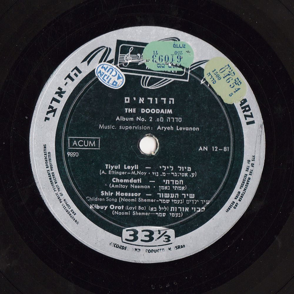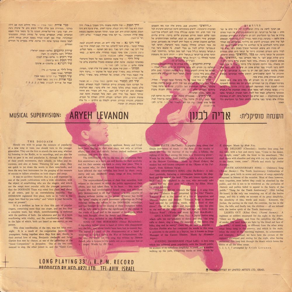 The unprecedented success of their first recording, bore witness to the extent to which the public appreciated their efforts, and had taken them to its heart — this team of singers who had revolutionised Israeli song, and who have ably demonstrated to all that "Sabras" are also capable of singing without jarring on the senses. Whoever has heard the "gang" singing at youth movement gatherings on Friday evenings before the release of the DOODAIM recordings, and has listened in to the singing of these youngsters today, will be fully able to realise the significance of the change in the youth of Israel and in the manner of its singing, which has been brought about by Benny and Israel.