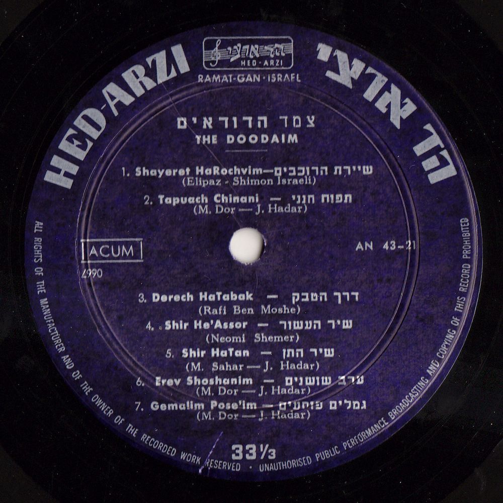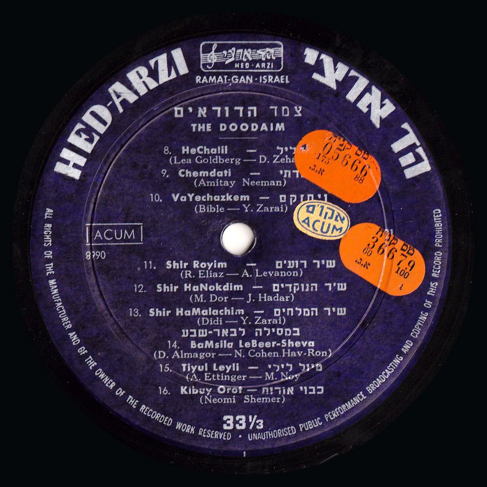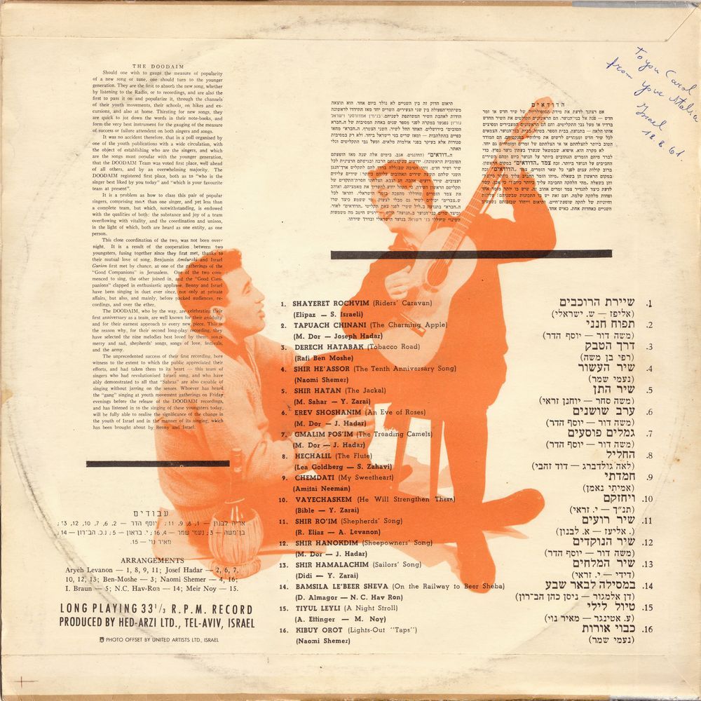 The unprecedented success of their first recording, bore witness to the extent to which the public appreciated their efforts, and had taken them to its heart — this team of singers who had revolutionised Israeli song, and who have ably demonstrated to all that Sabras" are also capable of singing without jarring on the senses Whoever has heard the "gang" singing at youth movement gatherings on Friday evenings before the release of the DOODAIM recordings, and has listened in to the singing of these youngsters today, will be fully able to realise the significance of the change in the youth of Israel and in the manner of its singing, which has been brought about by Benny and Israel.