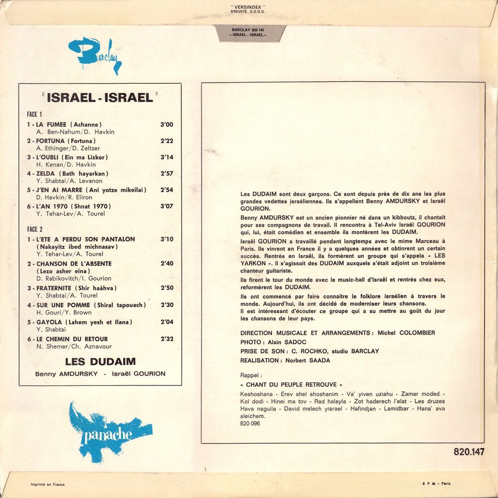 Benny AMDURSKY is a former pioneer born in a kibbutz, he sang for his fellow workers. He met Israel GOURION in Tel Aviv, who was an actor and together they mounted the DUDAIM.