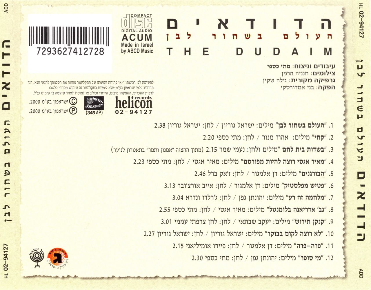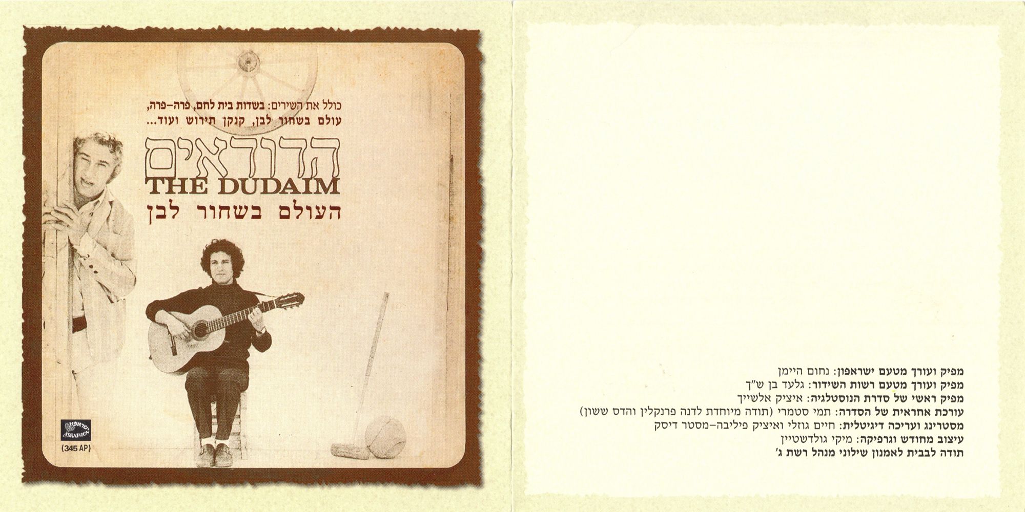The pair of Dudaim, Israel Gurion and Benny Amdursky were seen by the public as close to a pair of guitars, with a smile and wonderful voices. The CD that is presented to you is different from all the other Dudaim albums thanks to the touch of Matti Caspi, the arranger and the producer.