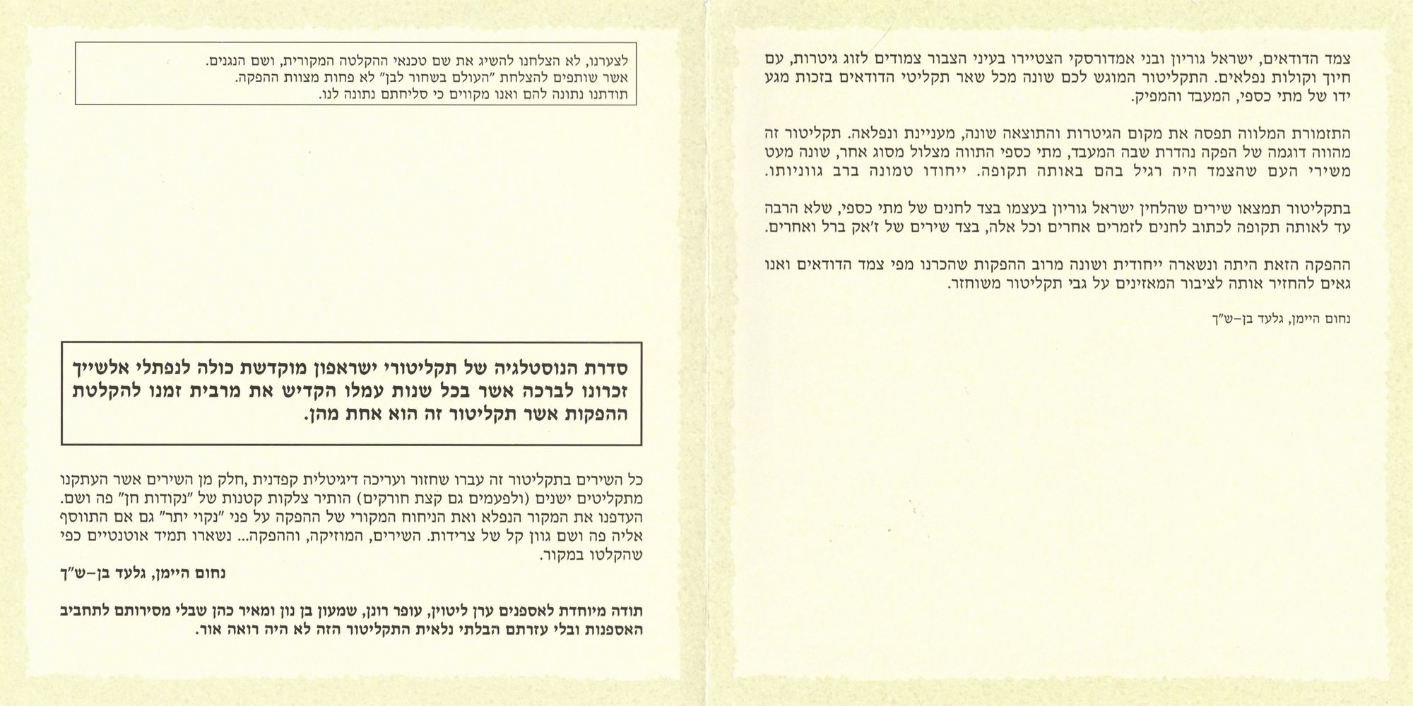 Unfortunately, we could not get the name of the original recording technician, and the name of the musicians, who share the success of the World in Black and White no less than the production team, and we thank them and hope that they are forgiven. The series of nostalgia of the Israpon CDs is dedicated entirely to Naftali Alsheikh, who in all his years spent most of his time recording the productions of which this CD is one of them. All the songs on this CD were carefully restored and edited, some of the songs we copied from old (and sometimes a little squeaky) records left little scars of "points of grace" here and there. We preferred the original source and the original fragrance of the production to "over-indulgence" even if a slight tinge of hoarseness was added here and there. The songs, the music, and the production ... were always authentic as originally recorded.