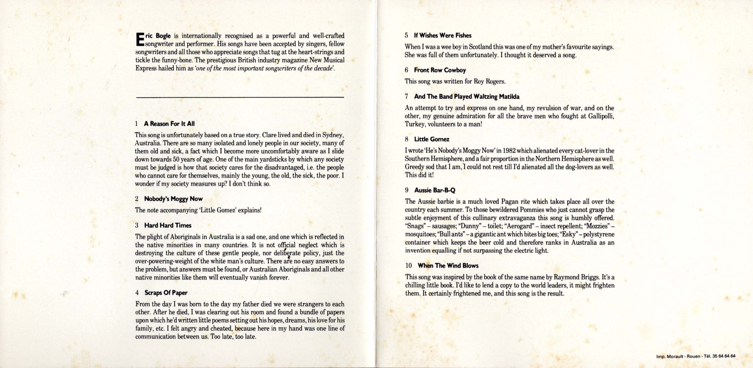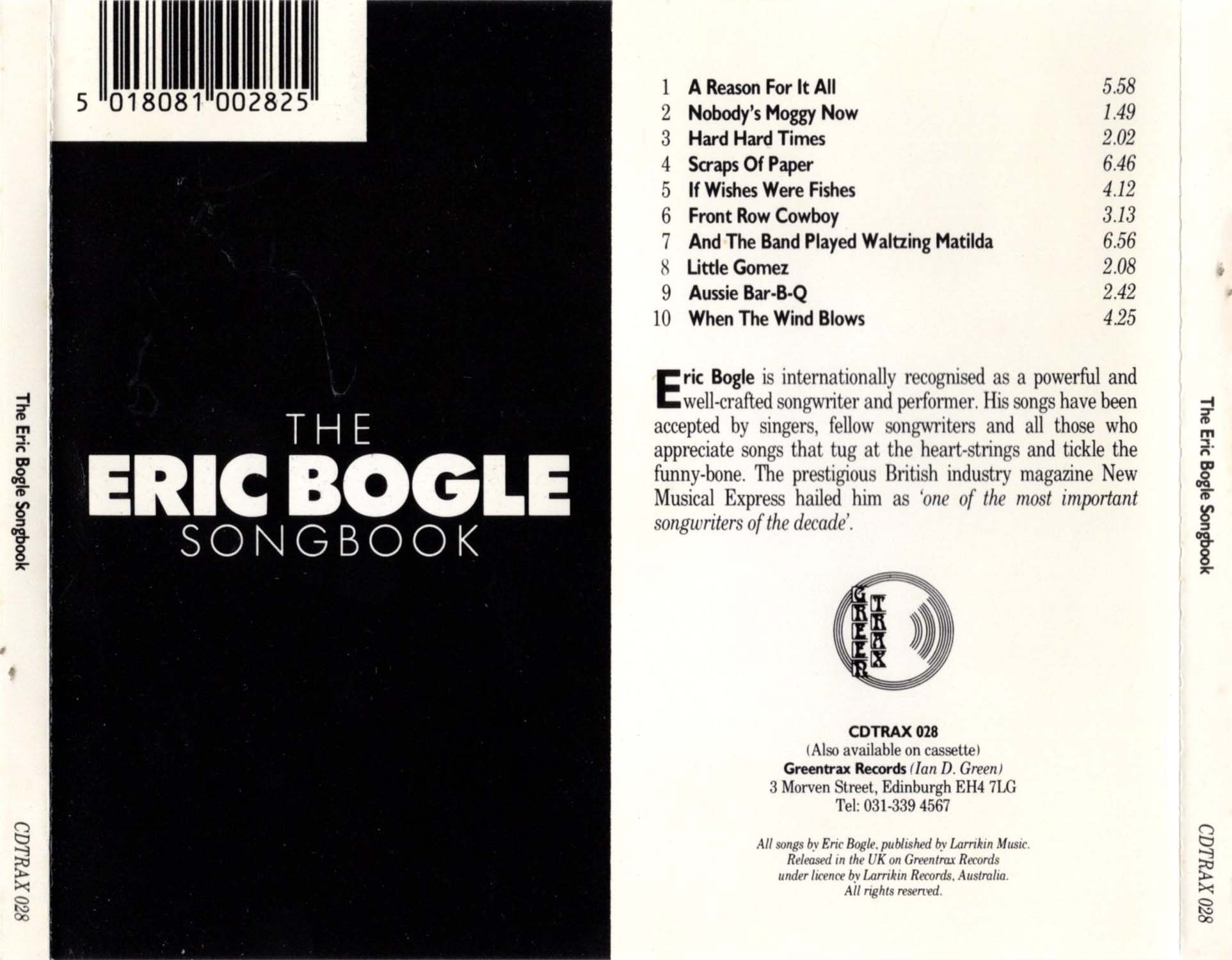 Eric Bogle is internationally recognised as a powerful and well-crafted songwriter and performer. His songs have been accepted by singers, fellow songwriters and all those who appreciate songs that tug at the heart-strings and tickle the funny-bone. The prestigious British industry magazine New Musical Express hailed him as 'one of the most important songwriters of the decade'.
