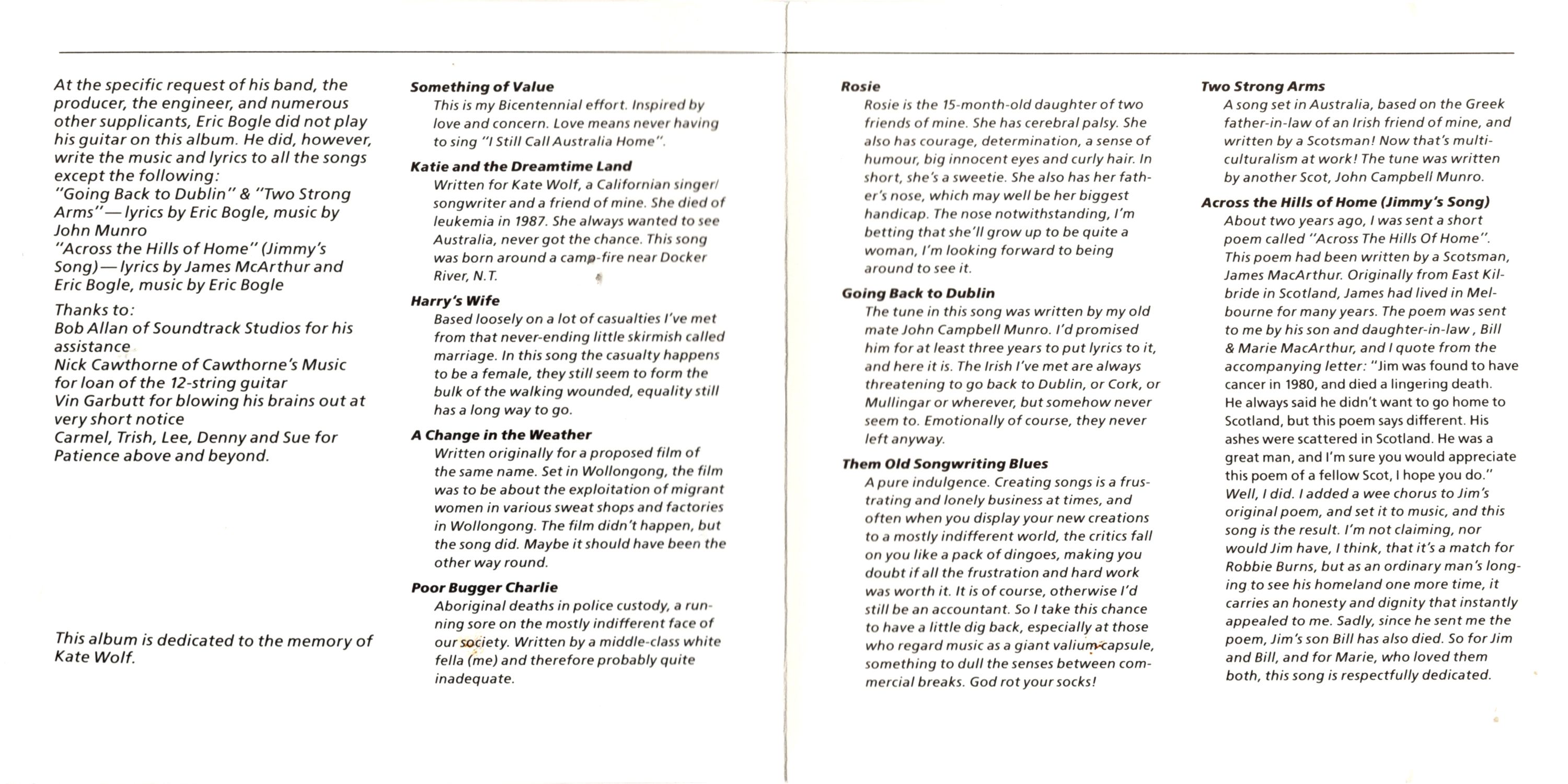 Katie And the Dreamtime Land — Written for Kate Wolf, a Californian singer/songwriter and a friend of mine. She died of leukemia in 1987. She always wanted to see Australia, never got the chance. This song was born around a campfire near Docker River, NT.