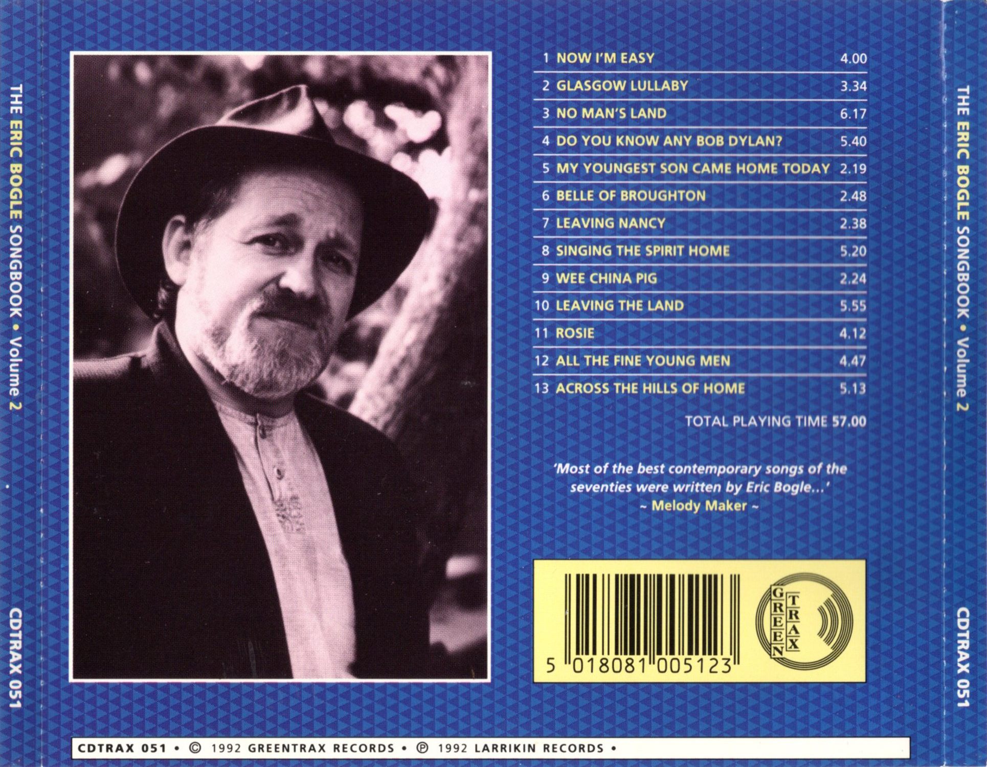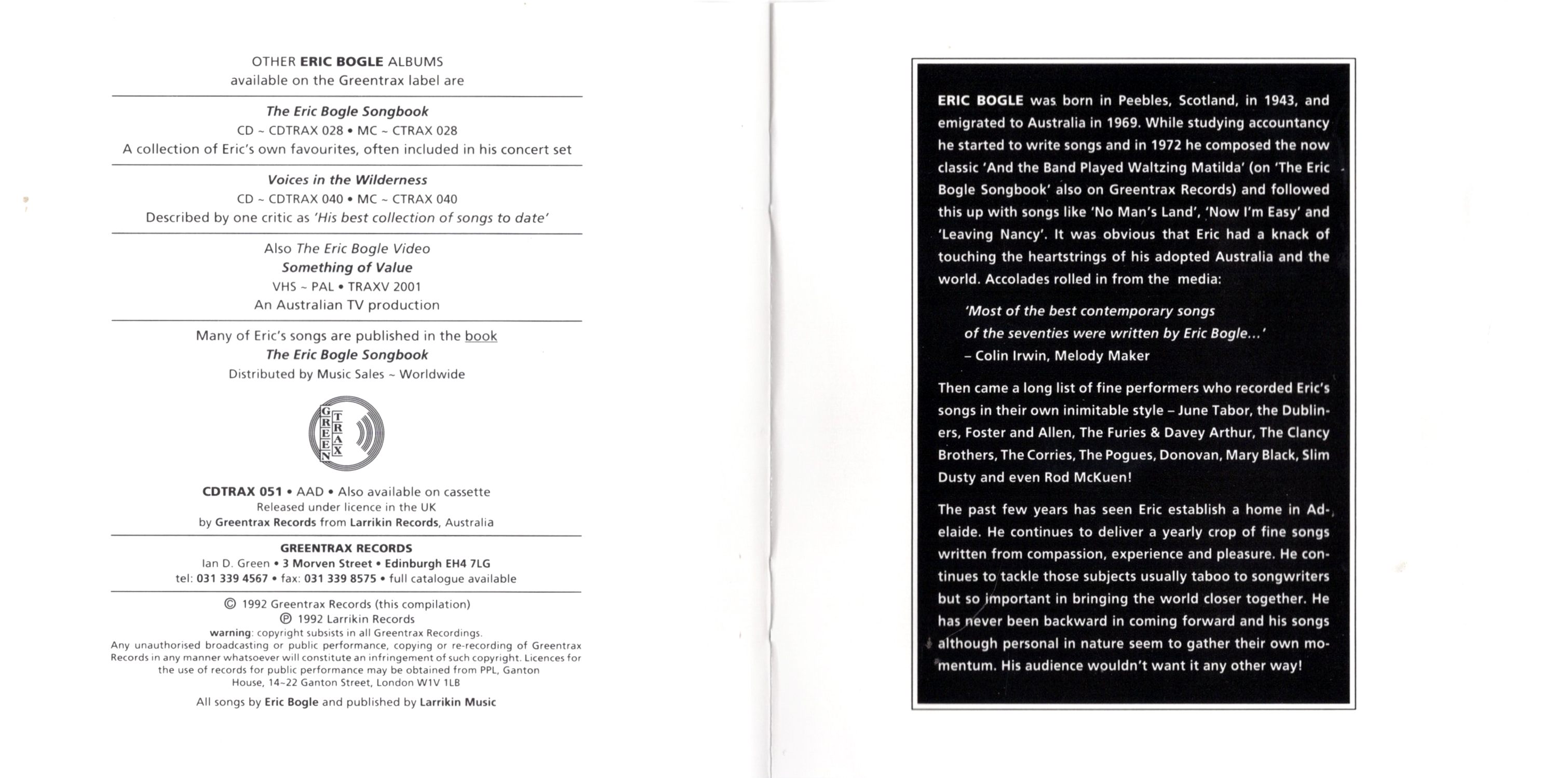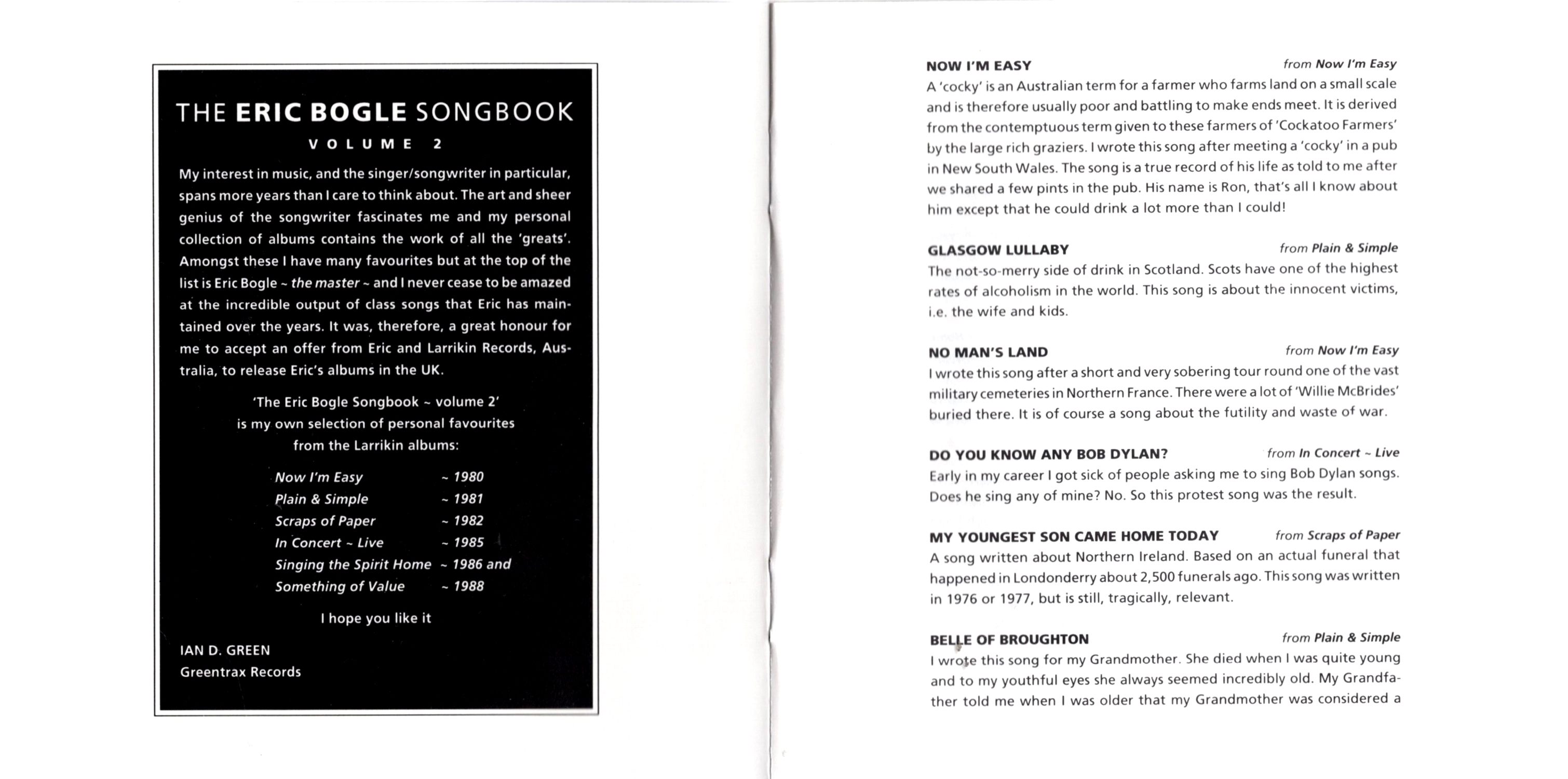 My interest in music, and the singer/songwriter in particular, spans more years than I care to think about. The art and sheer genius of the songwriter fascinates me and my personal collection of albums contains the work of all the 'greats'. Amongst these I have many favourites but at the top of the list is Eric Bogle — the master — and I never cease to be amazed at the incredible output of class songs that Eric has maintained over the years. It was, therefore, a great honour for me to accept an offer from Eric and Larrikin Records, Australia, to release Eric's albums in the UK. 'The Eric Bogle Songbook — volume 2' is my own selection of personal favourites from the Larrikin albums: