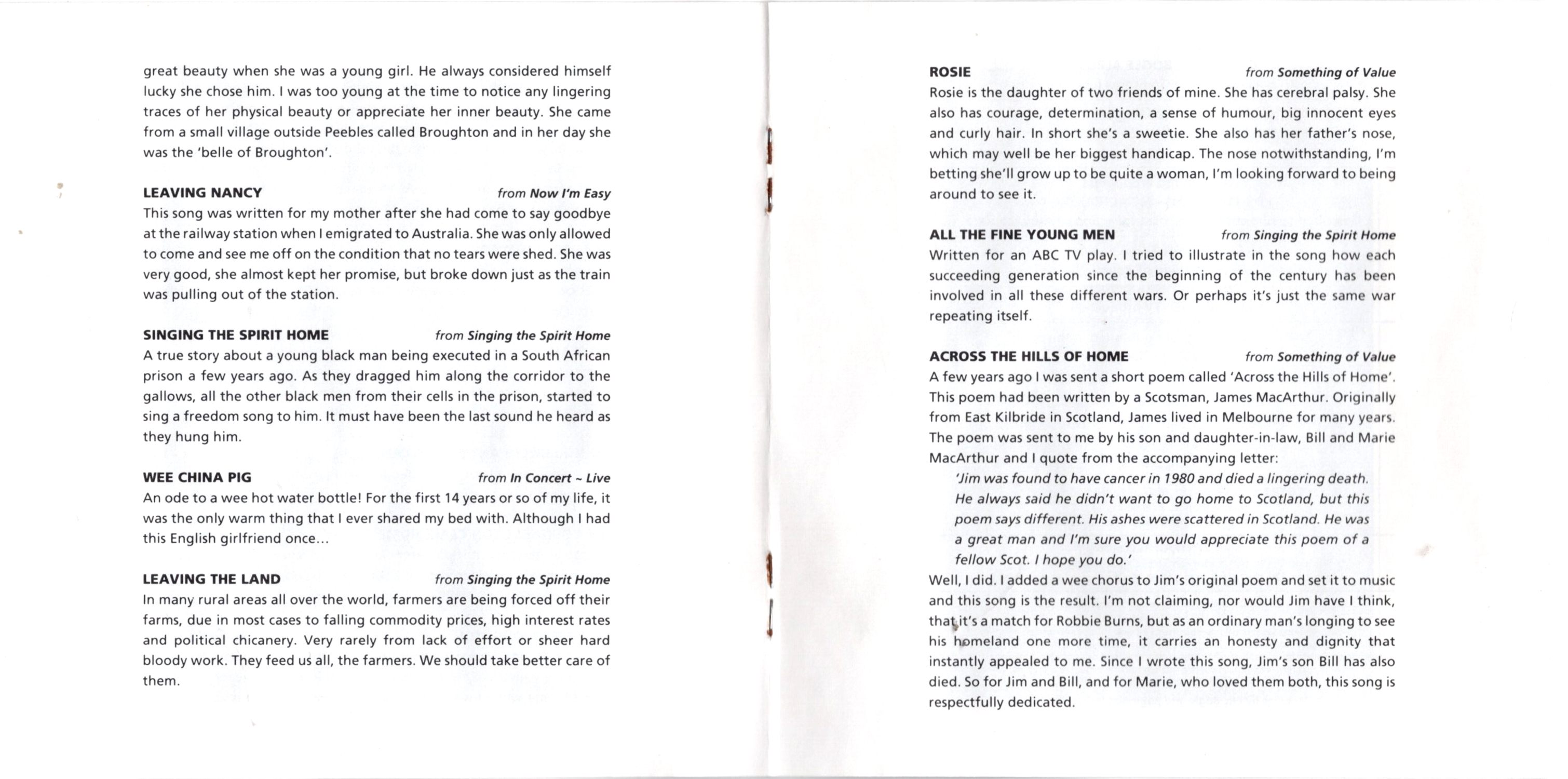Leaving Nancy — This song was written for my mother after she had come to say goodbye at the railway station when I emigrated to Australia. She was only allowed to come and see me off on the condition that no tears were shed. She was very good, she almost kept her promise, but broke down just as the train was pulling out of the station.