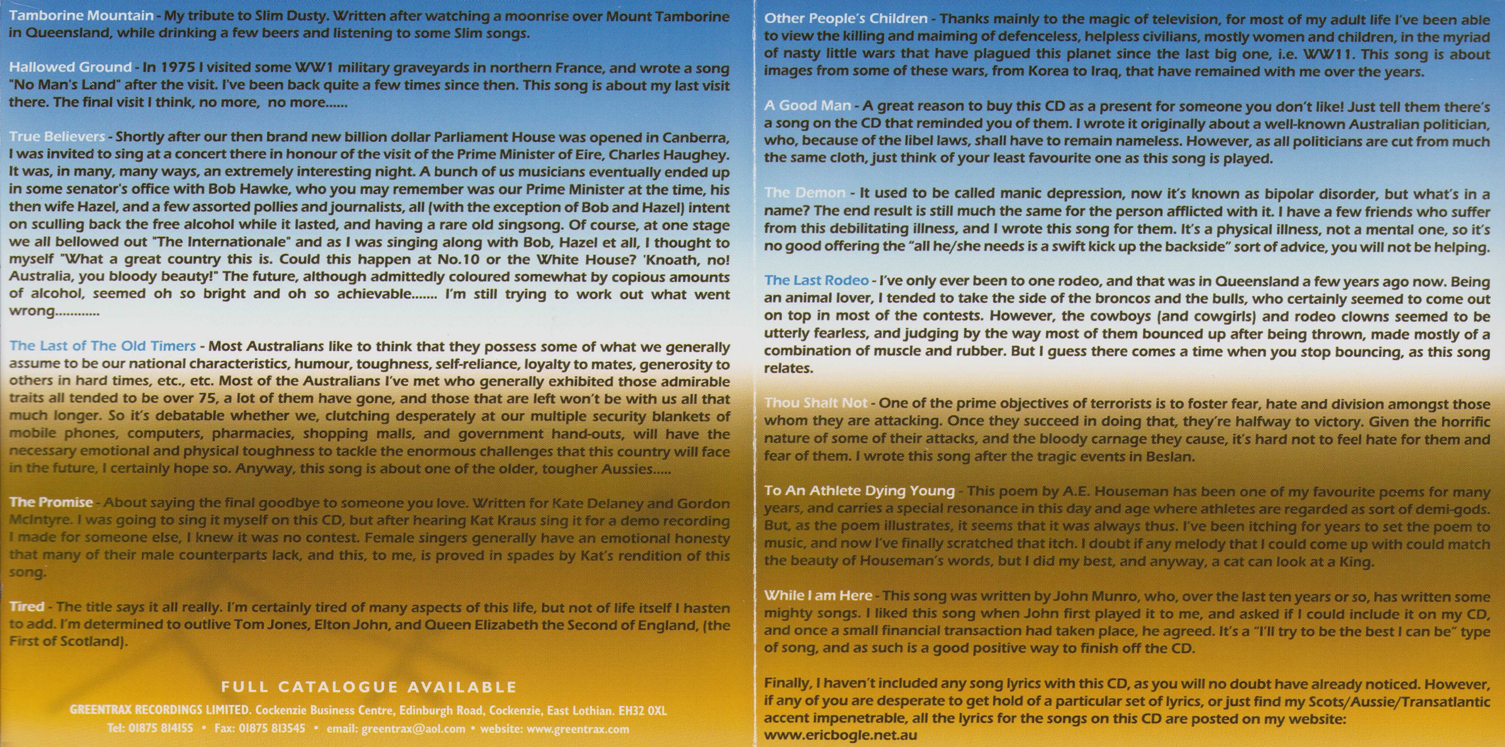 While I am Here — This song was written by John Munro, who over the last ten years or so, has written some mighty songs. I liked this song when John first played it to me, and I asked him if I could include it on my CD, and once a small financial transaction had taken place, he agreed. It's a "I'll try to be the best I can be" type of song, and as such is a good positive way to finish off the CD.