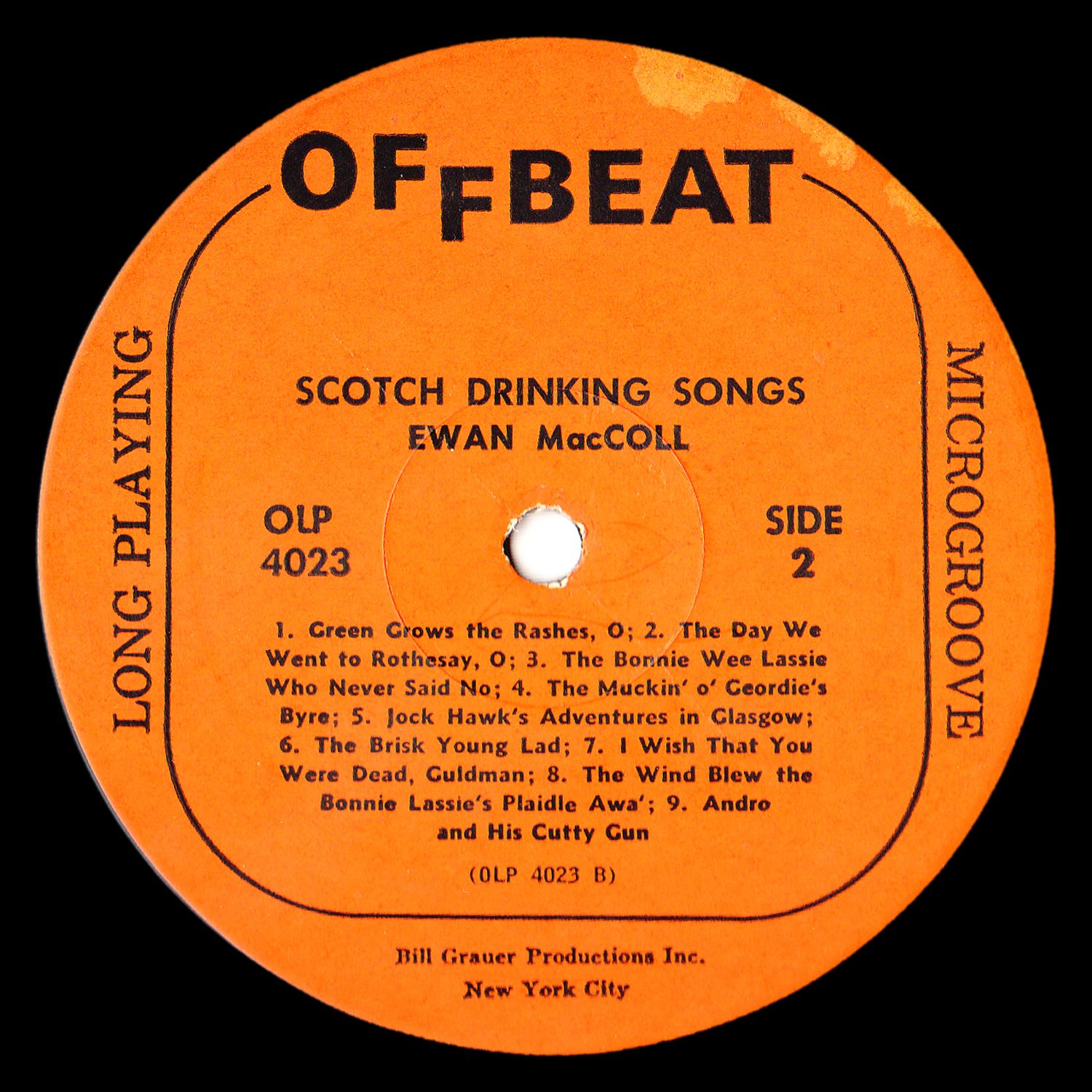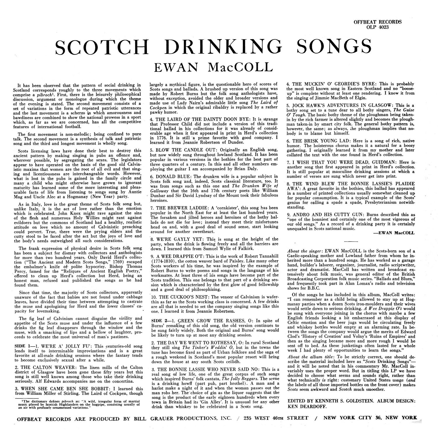 Of the songs he has included in this album, MacColl writes: "I can remember as a child being allowed to stay up at Hogmanay parties when a dozen Scots iron-moulders and their wives would settle down to serious drinking. A Wee Drappie O't would be sung with everyone joining in the chorus with maybe a few English friends looking a bit embarrassed at this display of Celtic emotion and the beer jugs would be circulating freely and whiskey bottles would empty at an alarming rate. In between the songs the company would argue the merits of Edward Clod's 'History of Creation' and Volny's 'Ruins of Empires' and then as the singing became more and more rough I would be sent off to bed. As these junketings often lasted for a whole week I had plenty of opportunities to learn the songs."