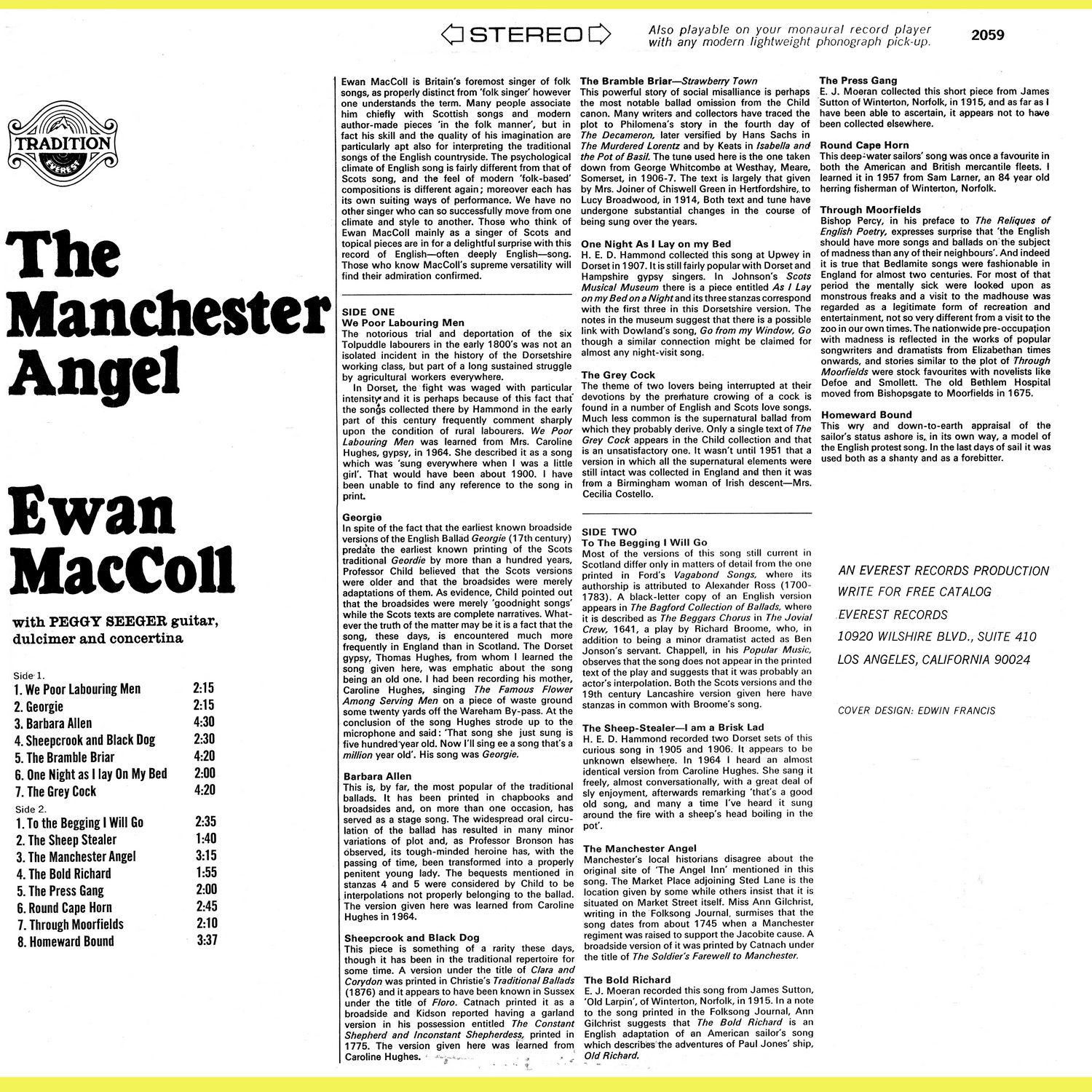 Ewan MacColl is Britain's foremost singer of folk songs, as properly distinct from 'folksinger' however one understands the term. Many people associate him chiefly with Scottish songs and modem author-made pieces 'in the folk manner', but in fact his skill and the quality of his imagination are particularly apt also for interpreting the traditional songs of the English countryside. The psychological climate of English song is fairly different from that of Scots song, and the feel of modern 'folk-based' compositions is different again; moreover each has its own suiting ways of performance. We have no other singer who can so successfully move from one climate and style to another. Those who think of Ewan MacColl mainly as a singer of Scots and topical pieces are in for a delightful surprise with this record of English — often deeply English — song. Those who know MacColl's supreme versatility will find their admiration confirmed.
