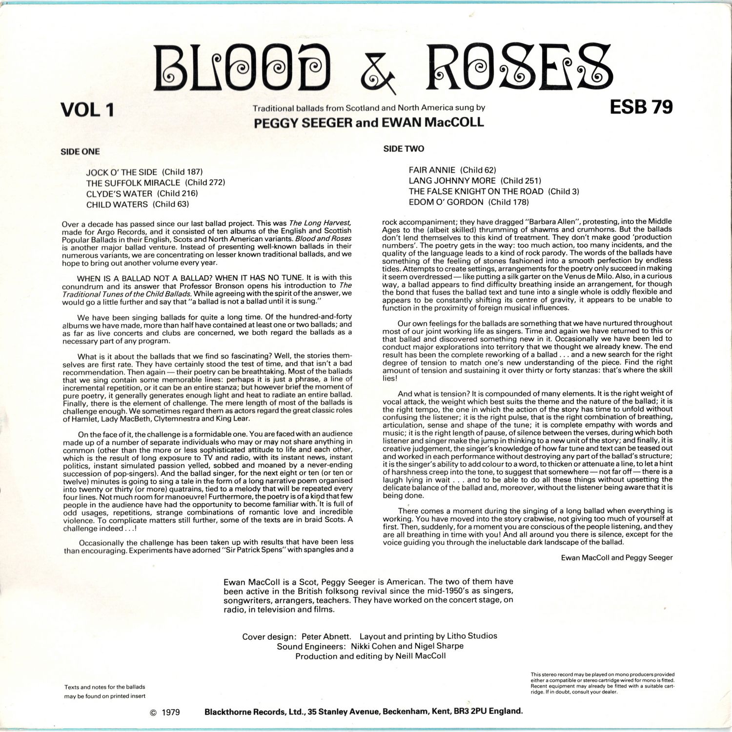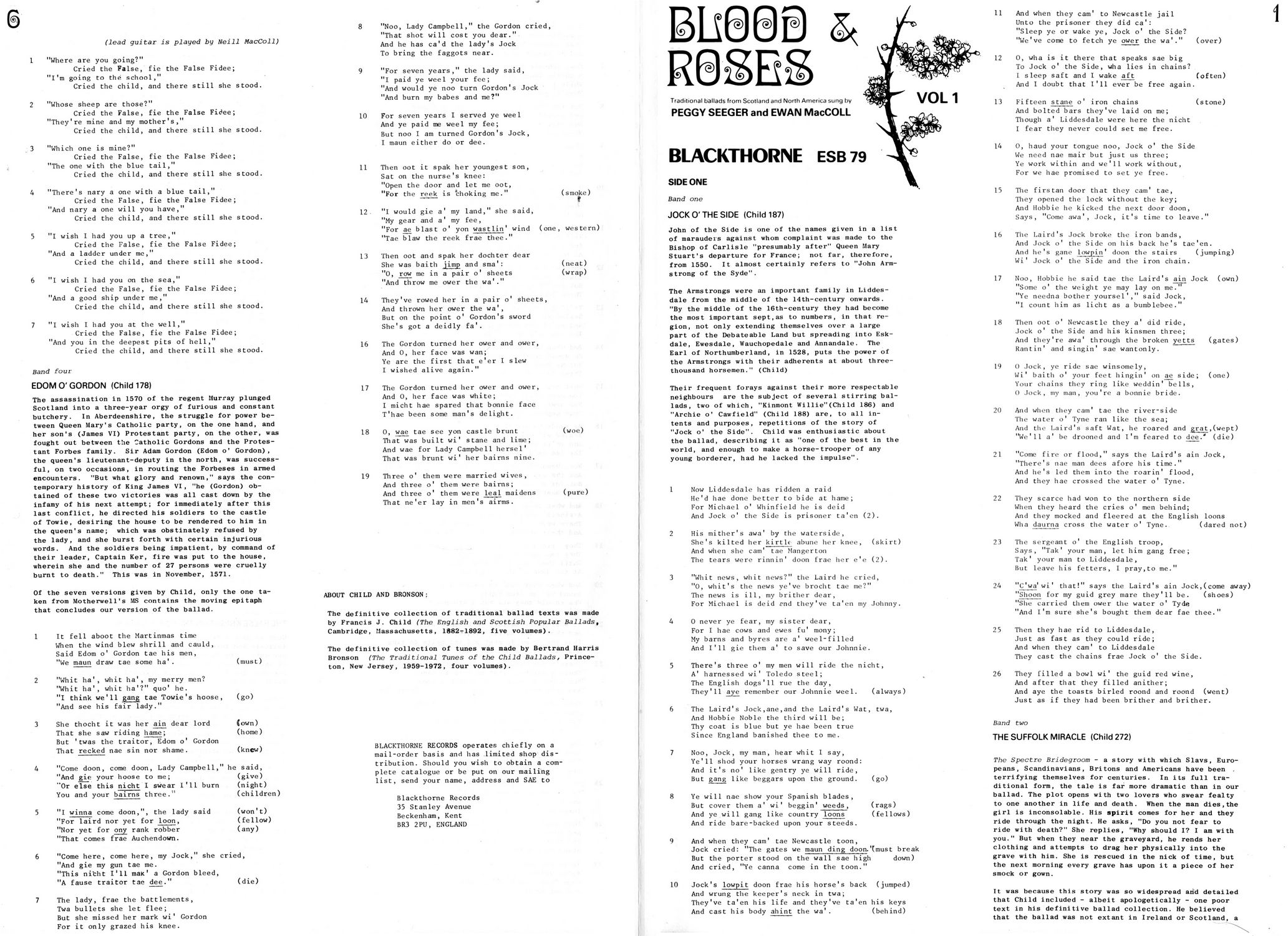 Over a decade has passed since our last ballad project. This was The Long Harvest, made for Argo Records, and it consisted of ten albums of the English and Scottish Popular Ballads in their English, Scots and North American variants. Blood and Roses is another major ballad venture. Instead of presenting well-known ballads in their numerous variants, we are concentrating on lesser known traditional ballads, and we hope to bring out another volume every year.