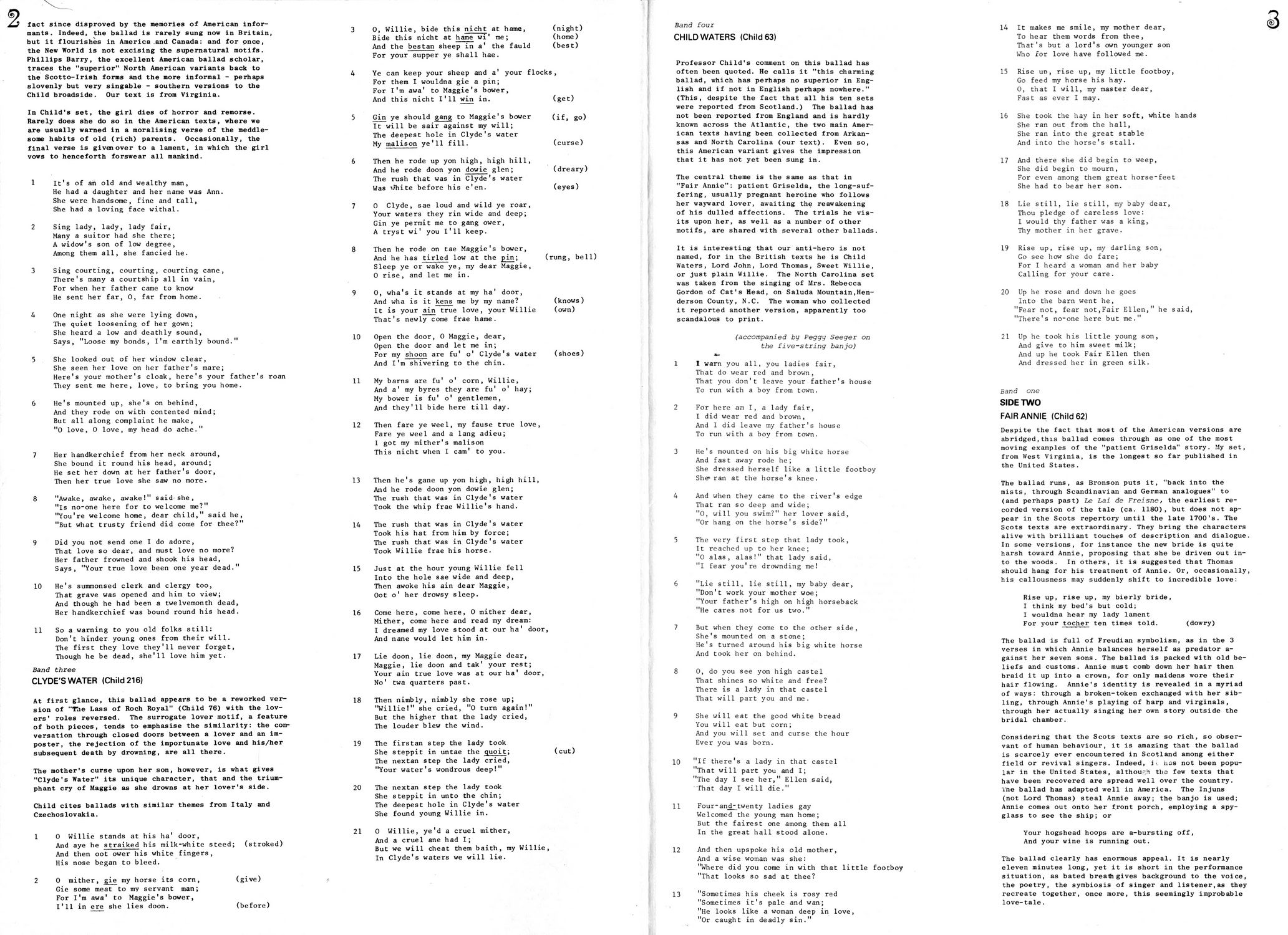 Fair Annie (Child 62) — Despite the fact that most of the American versions are abridged, this ballad comes through as one of the most moving examples of the "patient Griselda" story. My set, from West Virginia, is the longest so far published in the United States.