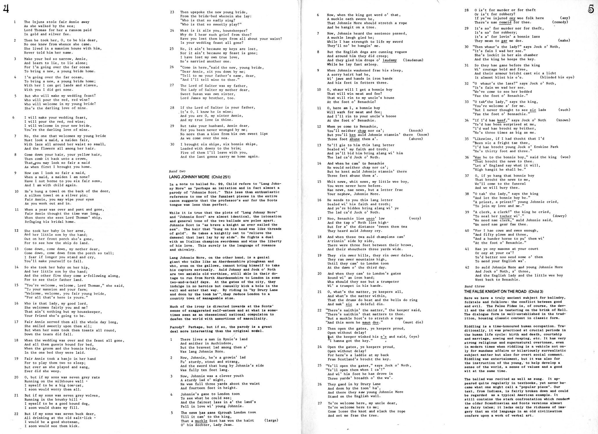 Lang Johnny More (Child 251) — In a note to ballad No. 99, Child refers to "Lang Johnny More" as "perhaps an imitation" and in fact almost a parody of "Johnnie Scot." This less than enthusiastic reference to one of the funniest pieces in the entire canon suggests that the professor's ear for the Scots tongue was less than perfect.