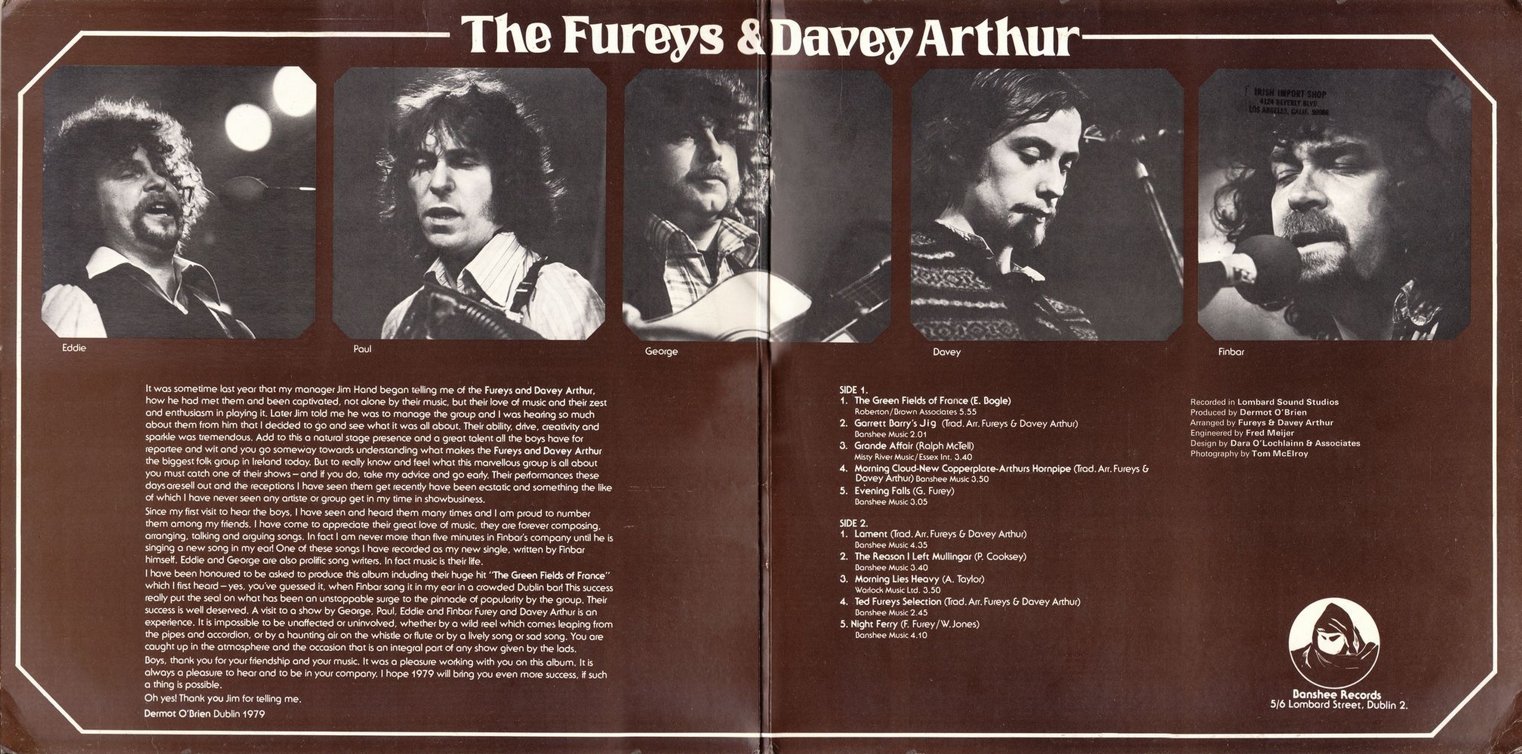 I have been honoured to be asked to produce this album including their huge hit "The Green Fields of France'" which I first heard-yes, you've guessed it, when Finbar sang it in my ear in a crowded Dublin bar! This success really put the seal on what has been an unstoppable surge to the pinnacle of popularity by the group. Their success is well deserved. A visit to a show by George, Paul, Eddie and Finbar Furey and Davey Arthur is an experience. It is impossible to be unaffected or uninvolved, whether by a wild reel which comes leaping from the pipes and accordion, or by a haunting air on the whistle or flute or by a lively song or sad song. You are caught up in the atmosphere and the occasion that is an integral part of any show given by the lads.