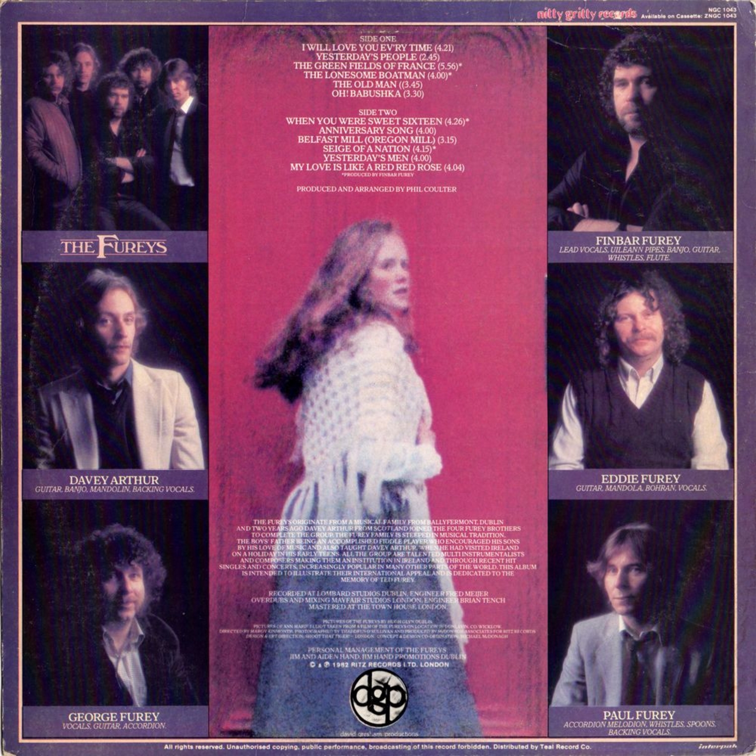 The Fureys originate from a musical family from Ballyermont, Dublin and two years ago Davey Arthur from Scotland joined the four Furey brothers to complete the group. The Furey family is steeped in musical tradition. The boys' father being an accomplished fiddle player who encouraged his sons by his love of music and also taught Davey Arthur who had visited Ireland on a holiday in his early teens. All the group are talented multi instrumentalists and composers making them an institution in Ireland and through recent hit singles and concerts, increasingly popular in many other parts of the world. This album is intended to illustrate their international appeal and dedicated to the memory of Ted Furey.