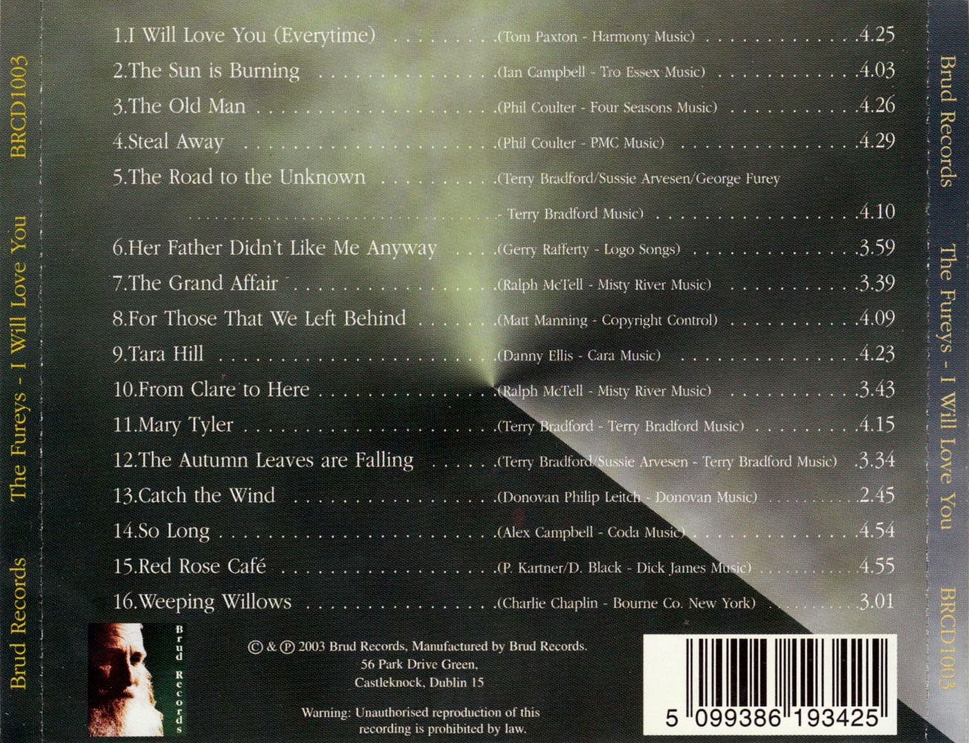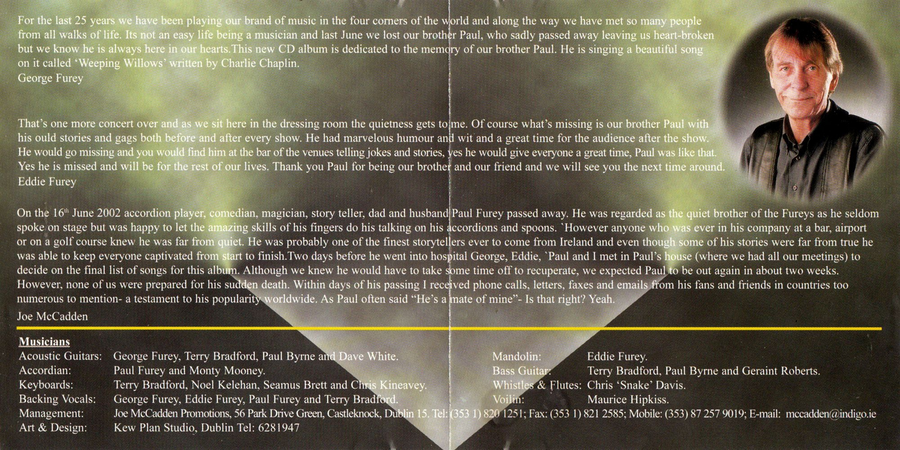 On the 16th June 2002 accordion player, comedian, magician, story teller, dad and husband Paul Furey passed away. He was regarded as the quiet brother of the Fureys as he seldom spoke on stage but was happy to let the amazing skills of his fingers do his talking on his accordions and spoons. However anyone who was ever in his company at a bar, airport or on a golf course knew he was far from quiet. He was probably one of the finest storytellers ever to come from Ireland and even though some of his stories were far from true he was able to keep everyone captivated from start to finish. Two days before he went into hospital George, Eddie, Paul and I met in Paul's house (where we had all our meetings) to decide on the final list of songs for this album. Although we knew he would have to take some time off to recuperate, we expected Paul to be out again in about two weeks. However, none of us were prepared for his sudden death. Within days of his passing I received phone calls, letters, faxes and emails from his fans and friends in countries too numerous to mention — a testament to his popularity worldwide. As Paul often said "He's a mate of mine" — Is that right? Yeah.