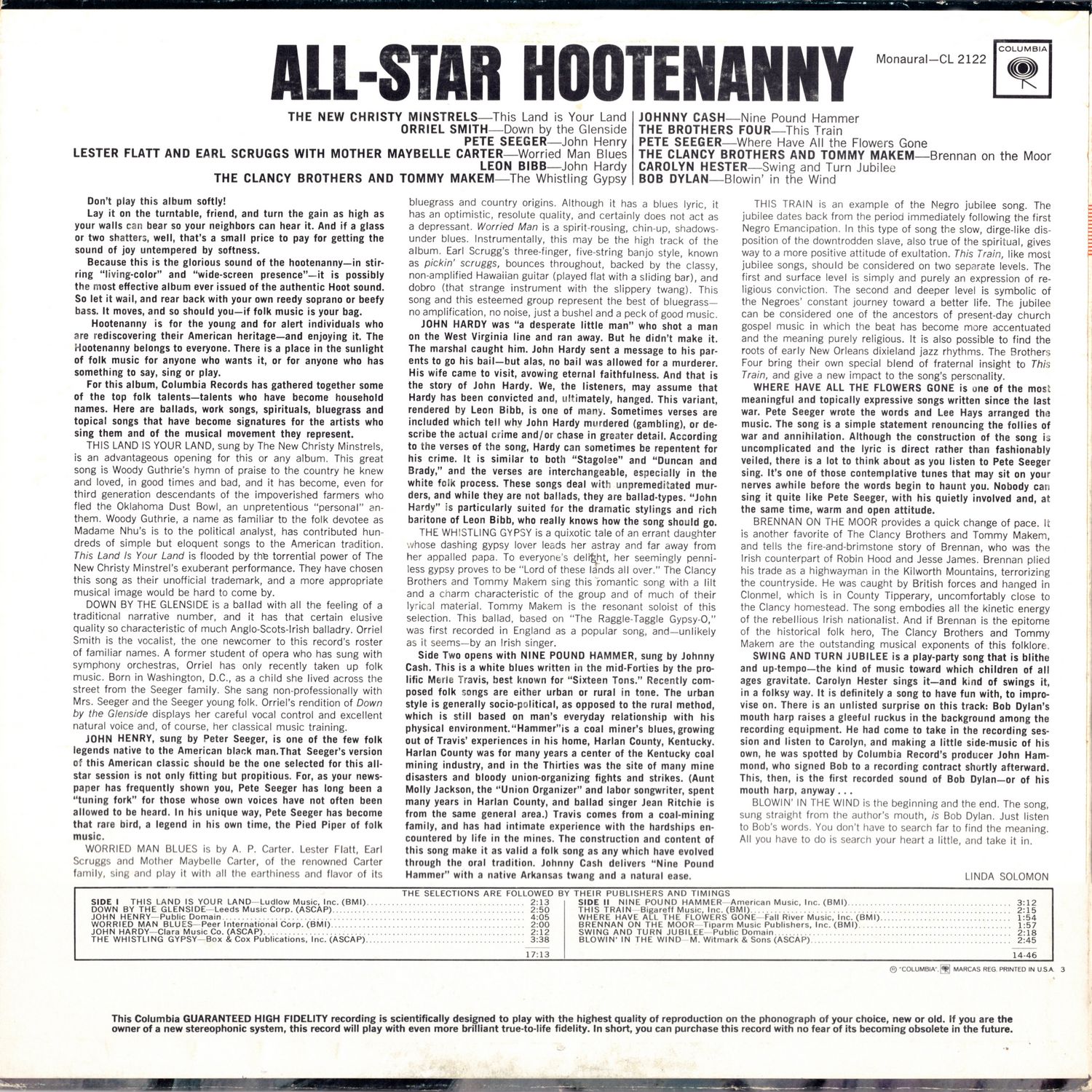 For this album, Columbia Records has gathered together some of the top folk talents — talents who have become household names. Here are ballads, work songs, spirituals, bluegrass and topical songs that have become signatures for the artists who sing them and of the musical movement they represent.