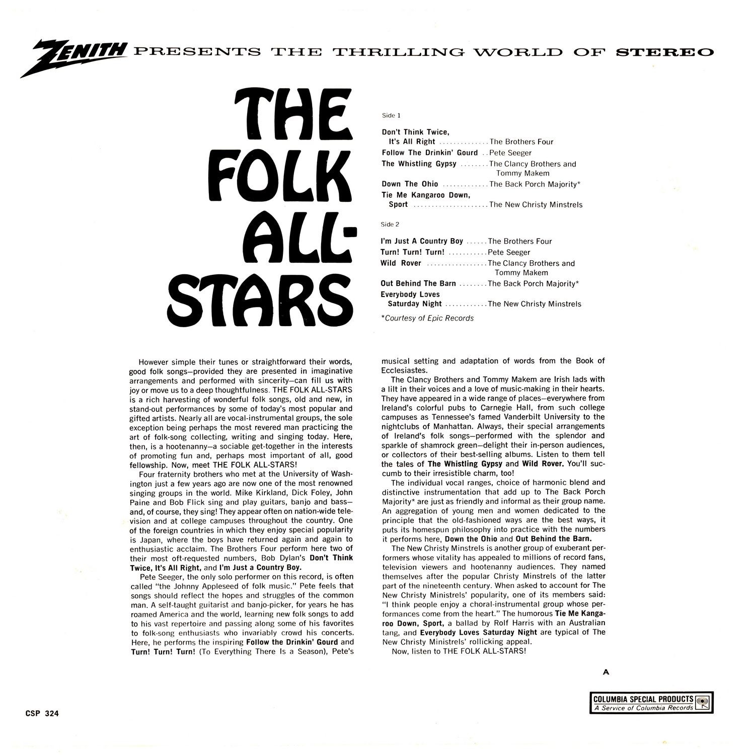 However simple their tunes or straightforward their words, good folk songs-provided they are presented in imaginative arrangements and performed with sincerity—can fill us with joy or move us to a deep thoughtfulness THE FOLK ALL-STARS is a rich harvesting of wonderful folk songs, old and new, in stand-out performances by some of today's most popular and gifted artists. Nearly all are vocal-instrumental groups, the sole exception being perhaps the most revered man practicing the art of folk-song collecting, writing and singing today. Here, then, is a hootenanny—a sociable get-together in the interests of promoting fun and, perhaps most important of all, good fellowship. Now, meet THE FOLK ALL-STARS!
