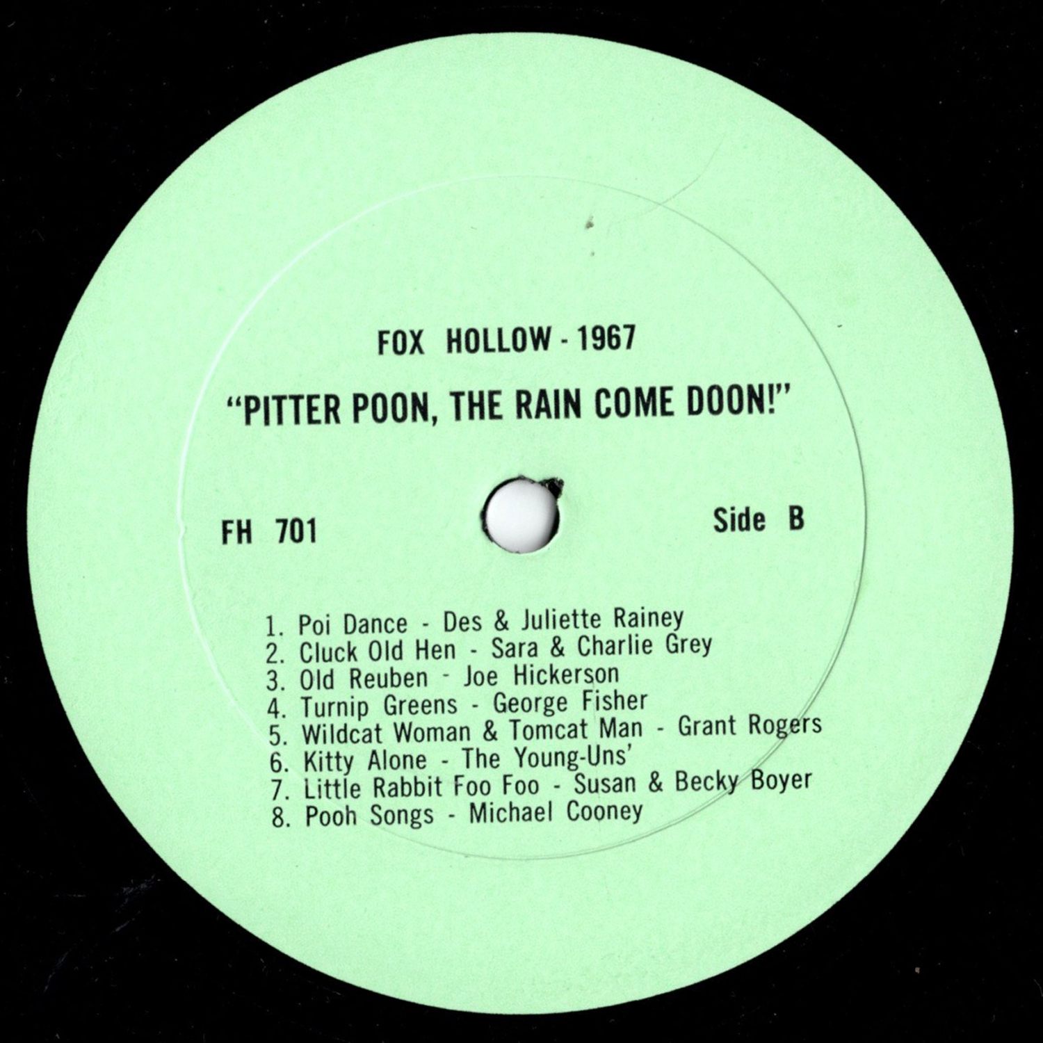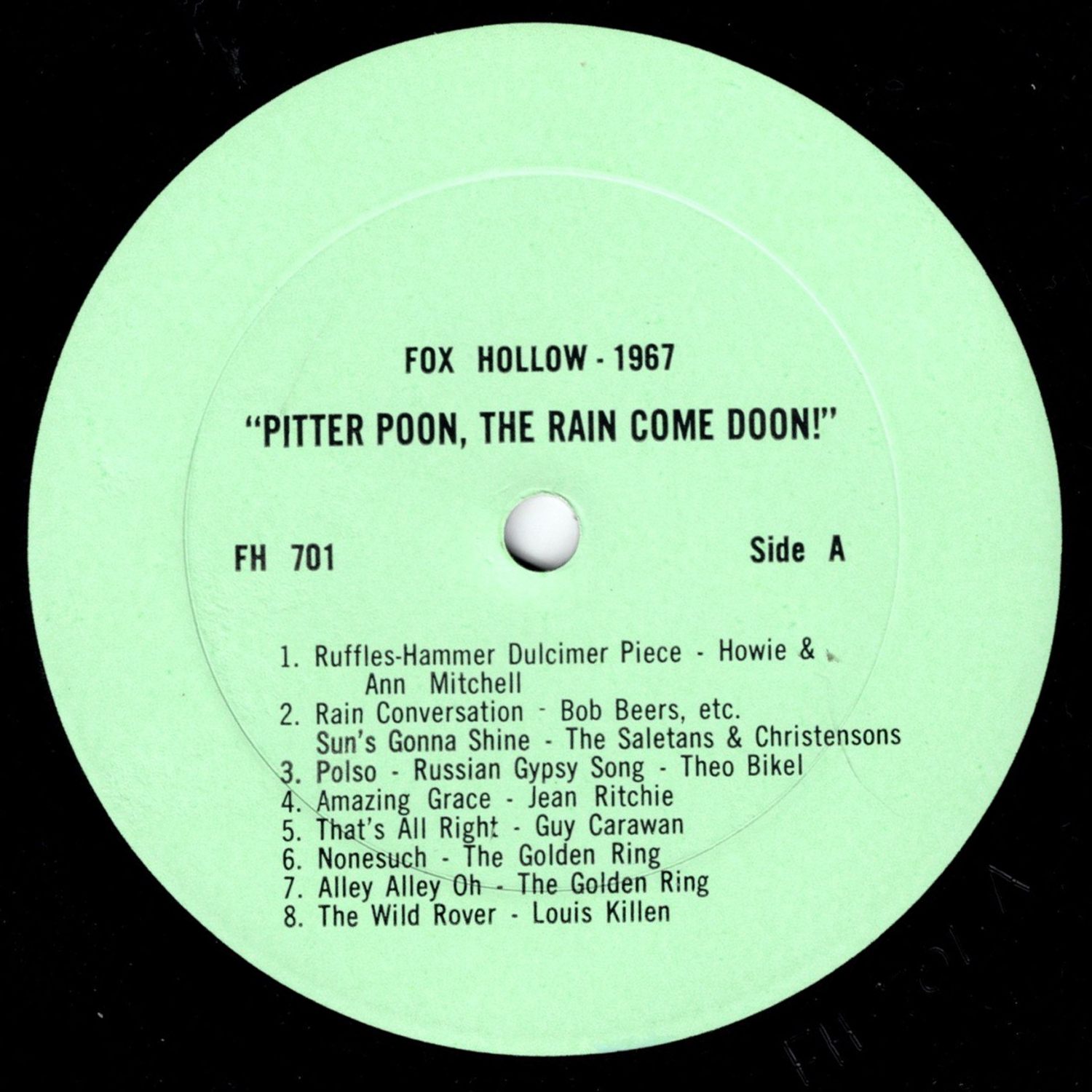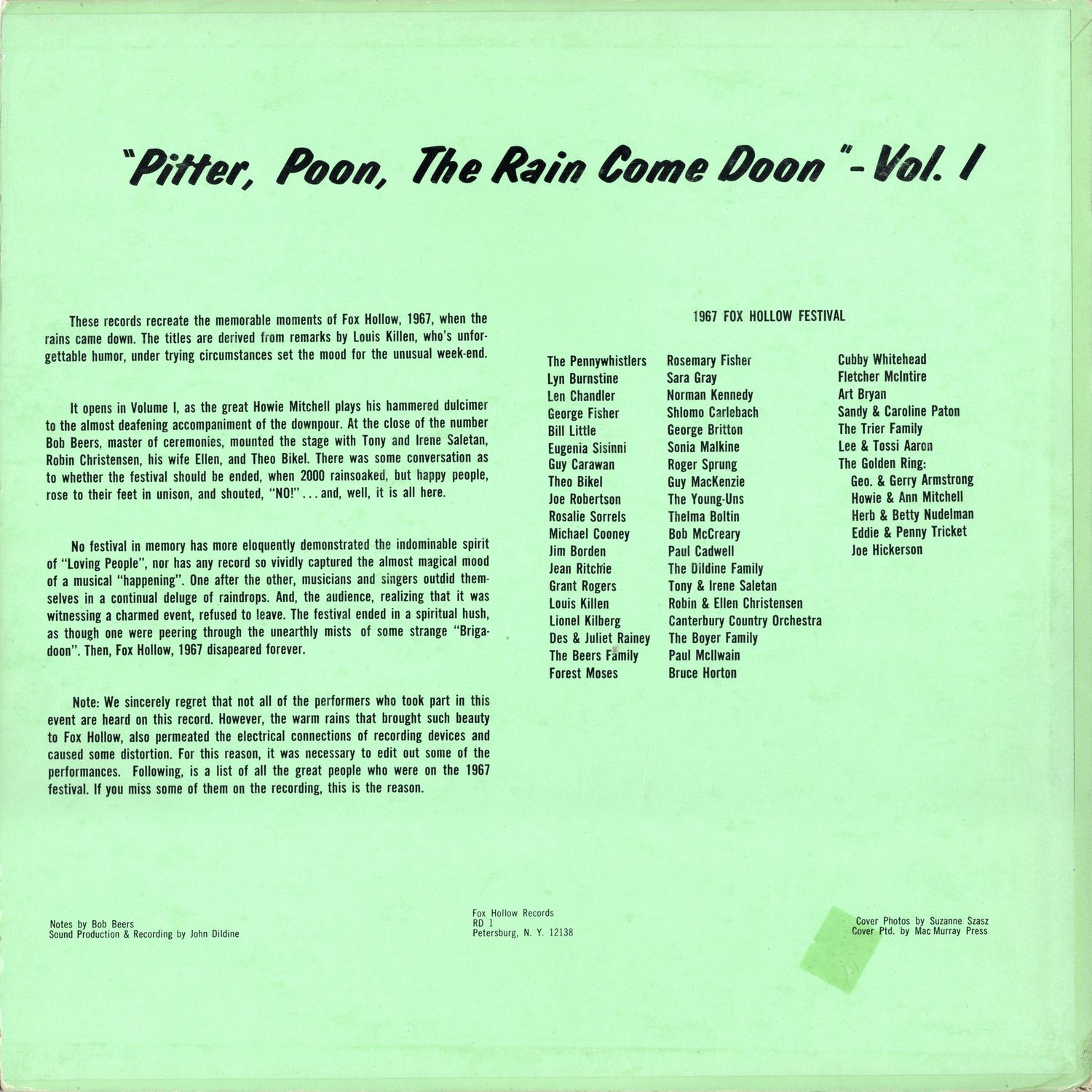 These records recreate the memorable moments of Fox Hollow, 1967, when the rains came down. The titles are derived from remarks by Louis Killen, who's unforgettable humor, under trying circumstances set the mood for the unusual week-end. It opens in Volume I, as the great Howie Mitchell plays his hammered dulcimer to the almost deafening accompaniment of the downpour. At the close of the number Bob Beers, master of ceremonies, mounted the stage with Tony and Irene Saletan, Robin Christensen, his wife Ellen, and Theo Bikel. There was some conversation as to whether the festival should be ended, when 2000 rain-soaked, but happy people, rose to their feet in unison, and shouted, "NO!" … and, well, it is all here. No festival in memory has more eloquently demonstrated the indomitable spirit of "Loving People", nor has any record so vividly captured the almost magical mood of a musical "happening". One after the other, musicians and singers outdid themselves in a continual deluge of raindrops. And, the audience, realizing that it was witnessing a charmed event, refused to leave. The festival ended in a spiritual hush, as though one were peering through the unearthly mists of some strange "Briga-doon". Then, Fox Hollow, 1967 disapeared forever.