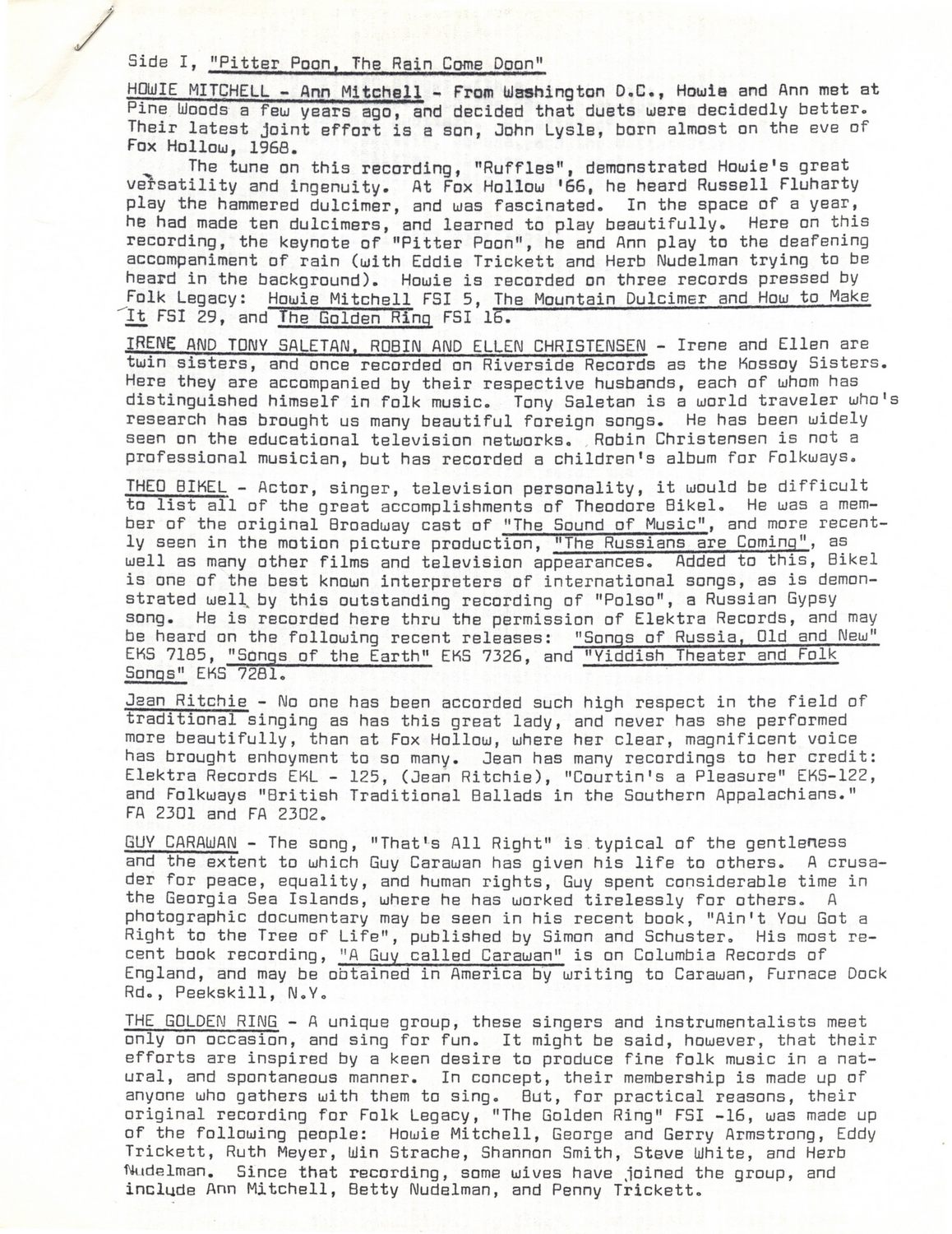 The tune on this recording, "Ruffles", demonstrated Howie's great versatility and ingenuity. At Fox Hollow '66, he heard Russell Fluharty play the hammered dulcimer, and was fascinated. In the space of a year, he had made ten dulcimers, and learned to play beautifully. Here on this recording, the keynote of "Pitter Poon", he and Ann play to the deafening accompaniment of rain (with Eddie Trickett and Herb Nudelman trying to be heard in the background). Howie is recorded on three records pressed by Folk Legacy: Howie Mitchell FSI 5, The Mountain Dulcimer and How to Make It FSI 29, and The Golden Ring FSI 16.