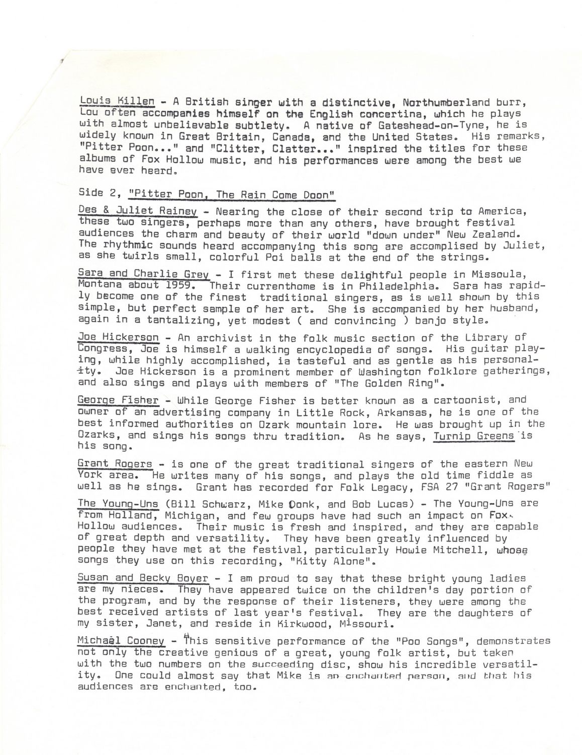 Note: We sincerely regret that not all of the performers who took part in this event are heard on this record. However, the warm rains that brought such beauty to Fox Hollow, also permeated the electrical connections of recording devices and caused some distortion. For this reason, it was necessary to edit out some of the performances. Following, is a list of all the great people who were on the 1967 festival. If you miss some of them on the recording, this the reason.