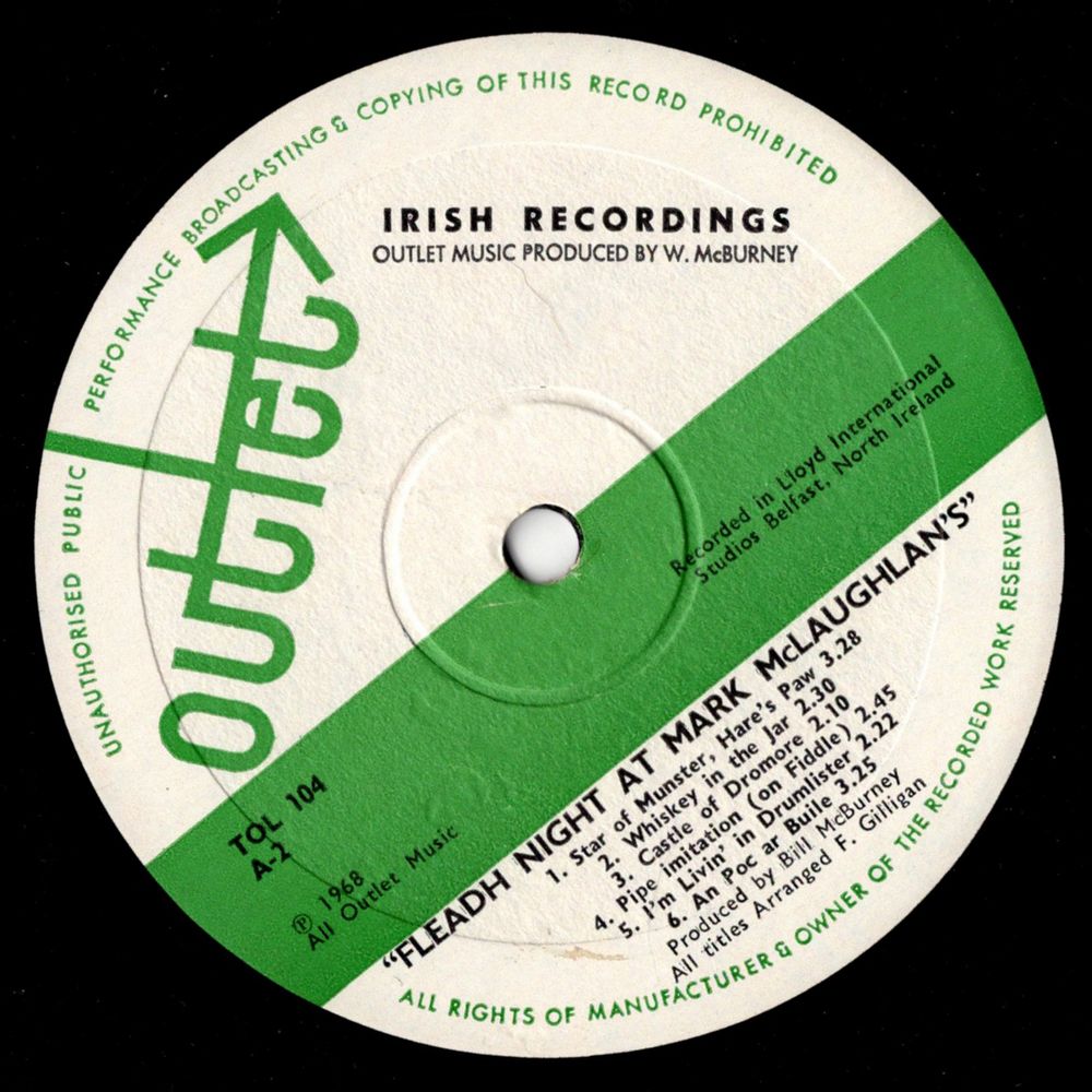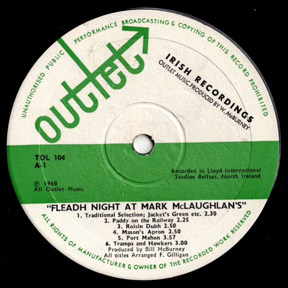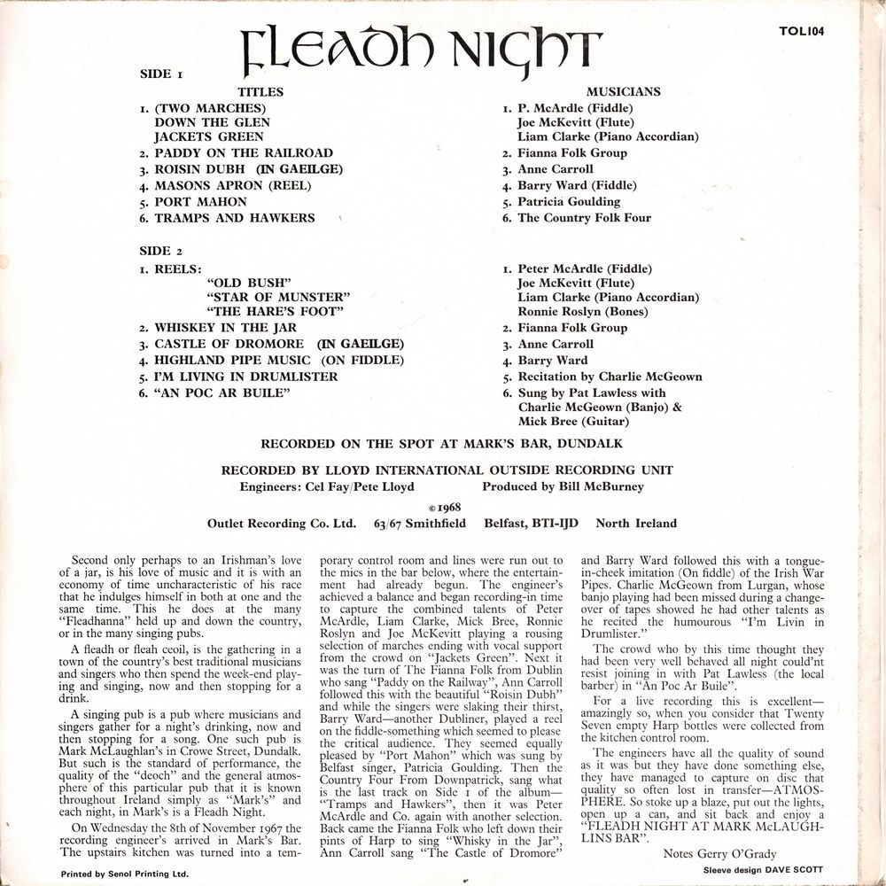 The engineers have all the quality of sound as it was but they have done something else, they have managed to capture on disc that quality so often lost in transfer — ATMOSPHERE. So stoke up a blaze, put out the lights, open up a can, and sit back and enjoy a "FLEADH NIGHT AT MARK McLAUGHLINS BAR".