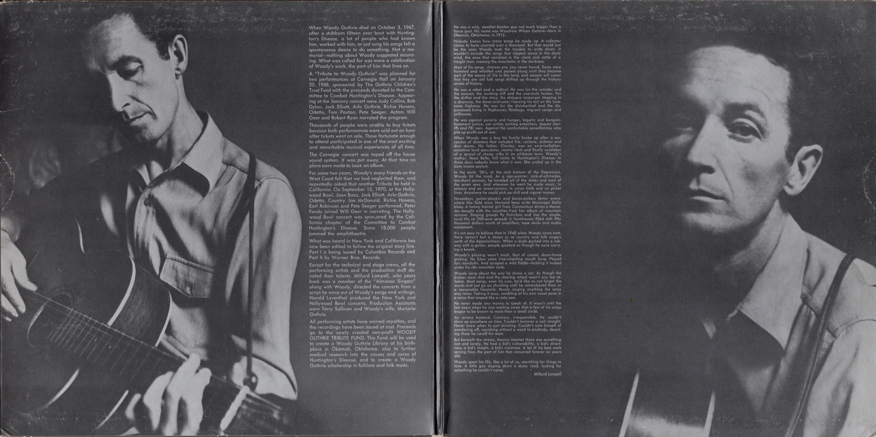 A "Tribute to Woody Guthrie" was planned for two performances at Carnegie Hall on January 20, 1968, sponsored by The Guthrie Children's Trust Fund with the proceeds donated to the Committee to Combat Huntington's Disease. Appearing at the January concert were Judy Collins, Bob Dylan, Jack Elliott, Arlo Guthrie, Richie Havens, Odetta, Tom Paxton, Pete Seeger. Actors Will Geer and Robert Ryan narrated the program.