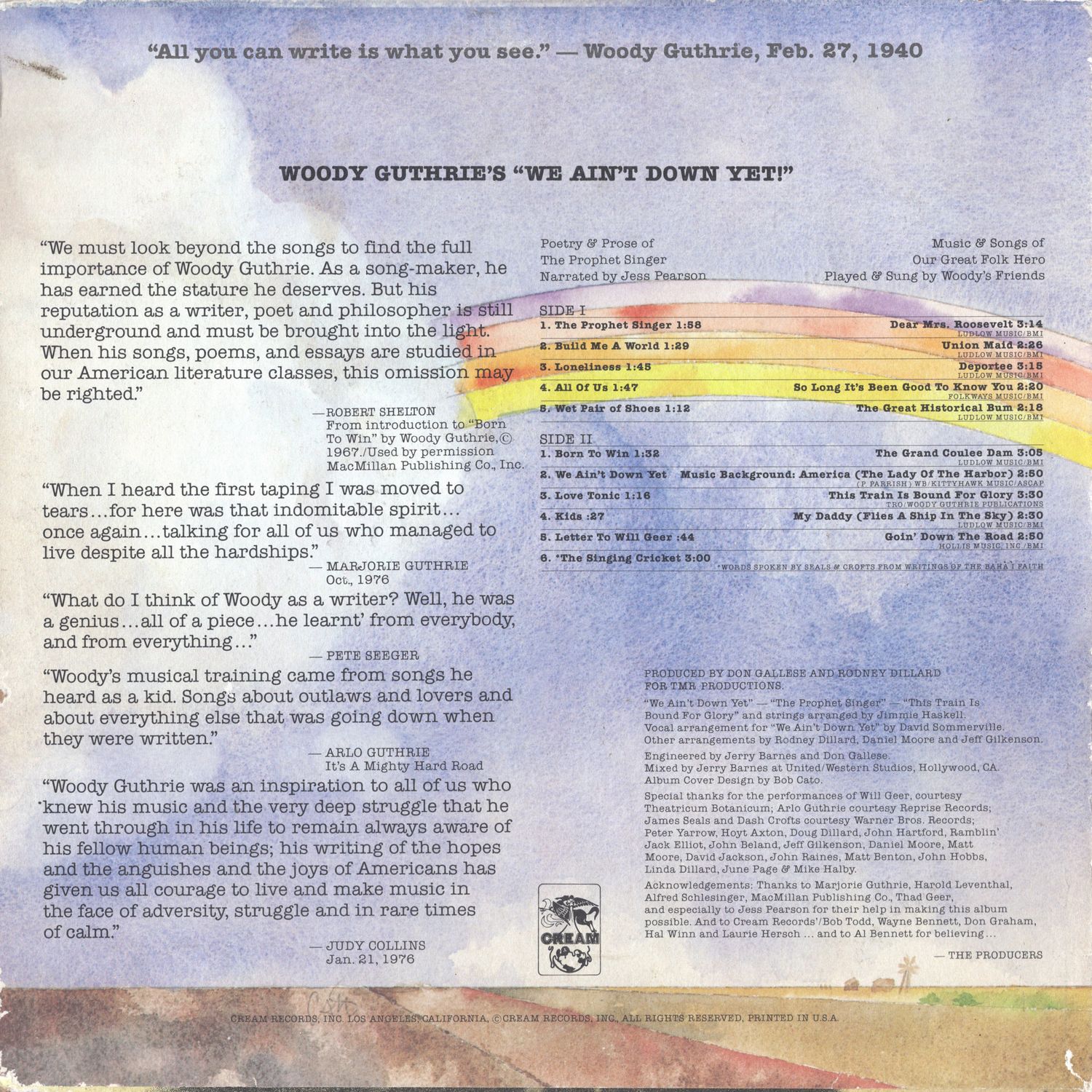 - Thanks to Marjorie Guthrie, Harold Leventhal, Alfred Schlesinger, MacMillan Publishing Co., Thad Geer, and especially to Jess Pearson for their help in making this album possible. And to Cream Records'/Bob Todd, Wayne Bennett, Don Graham, Hal Winn and Laurie Hersch … and to Al Bennett for believing … The Producers