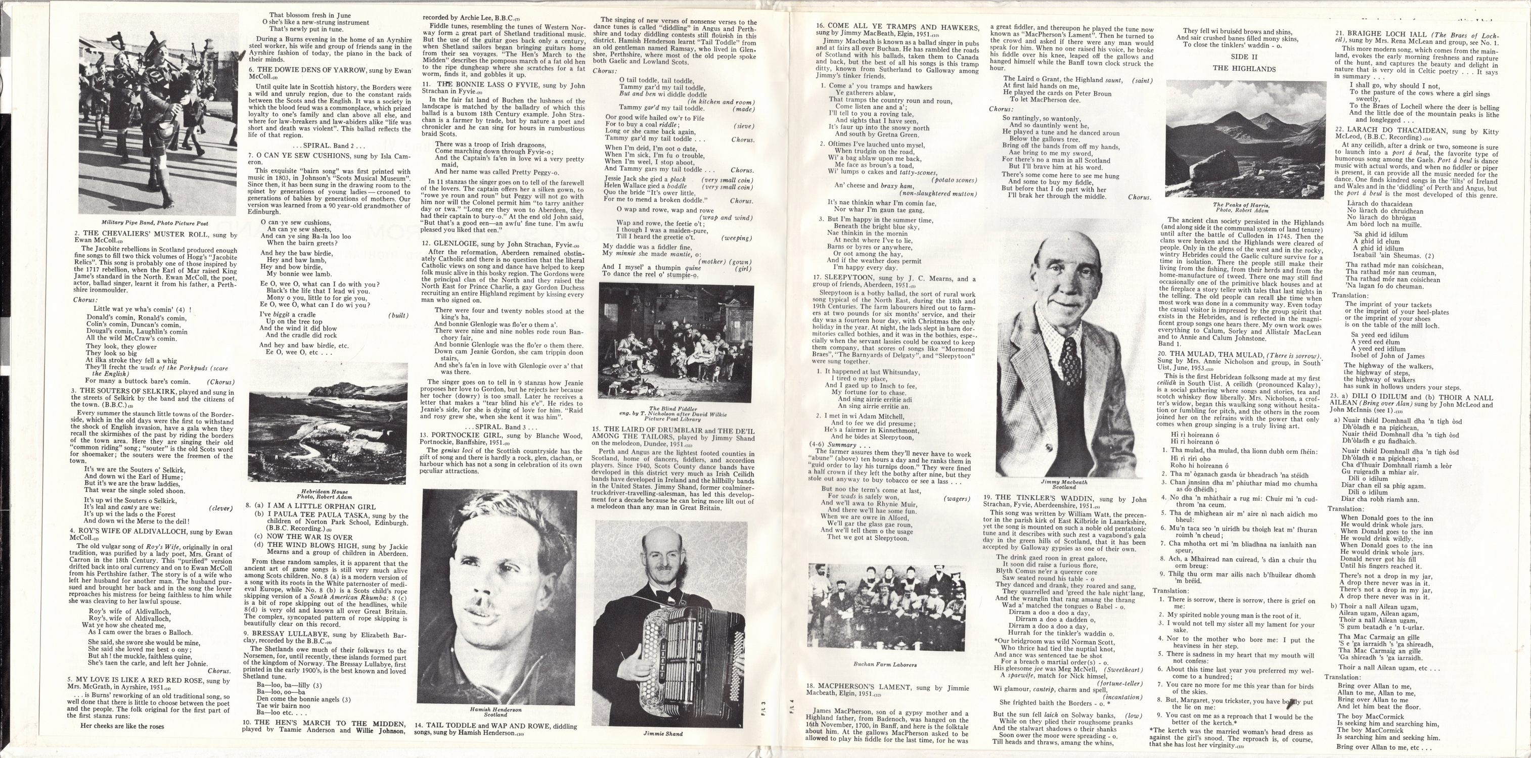 Scots folksong is extraordinarily nationalistic, the result of the centuries of wars with England. On the other hand, the nation of Scotland is divided into two very different cultural halves — the Highlands especially the Hebrides, where Gaelic is still spoken and where there still survives the remnants of the high and beautiful Gaelic culture — and the Lowlands, where the British popular ballad is at its very best and many people speak Lalands, a vernacular felt by the Scots to be a distinct language from English. Both of these regions have been much affected by their religious history. For instance, in some regions of the Hebrides the Presbyterian Kirk absolutely and effectively forbids all dancing; and in neighboring Catholic Islands the kalays last till morning. So one never knows what mixture of shame, joy or pride in his folk culture one will encounter in a Scot, but, whether it is love of bagpipes, Burns or border ballads, there is certain to be great enthusiasm for some sort of folk music.