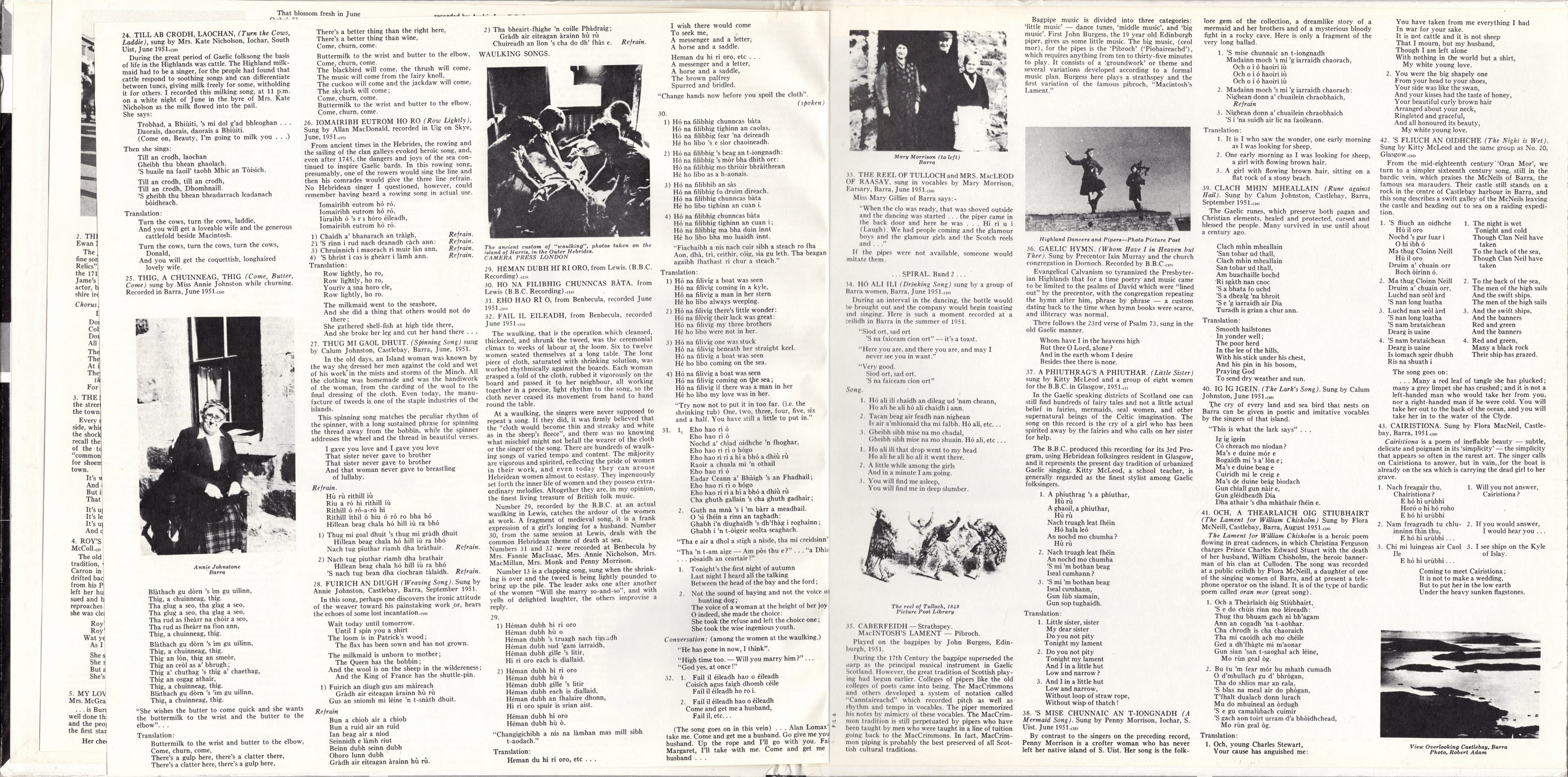 During the great period of Gaelic folksong the basis of life in the Highlands was cattle. The Highland milkmaid had to be a singer, for the people had found that cattle respond to soothing songs and can differentiate between tunes, giving milk freely for some, witholding it for others. I recorded this milking song, at 11 p.m. on a white night of June in the byre of Mrs. Kate Nicholson as the milk flowed into the pail.