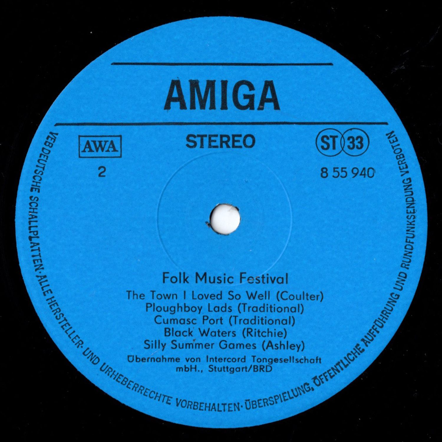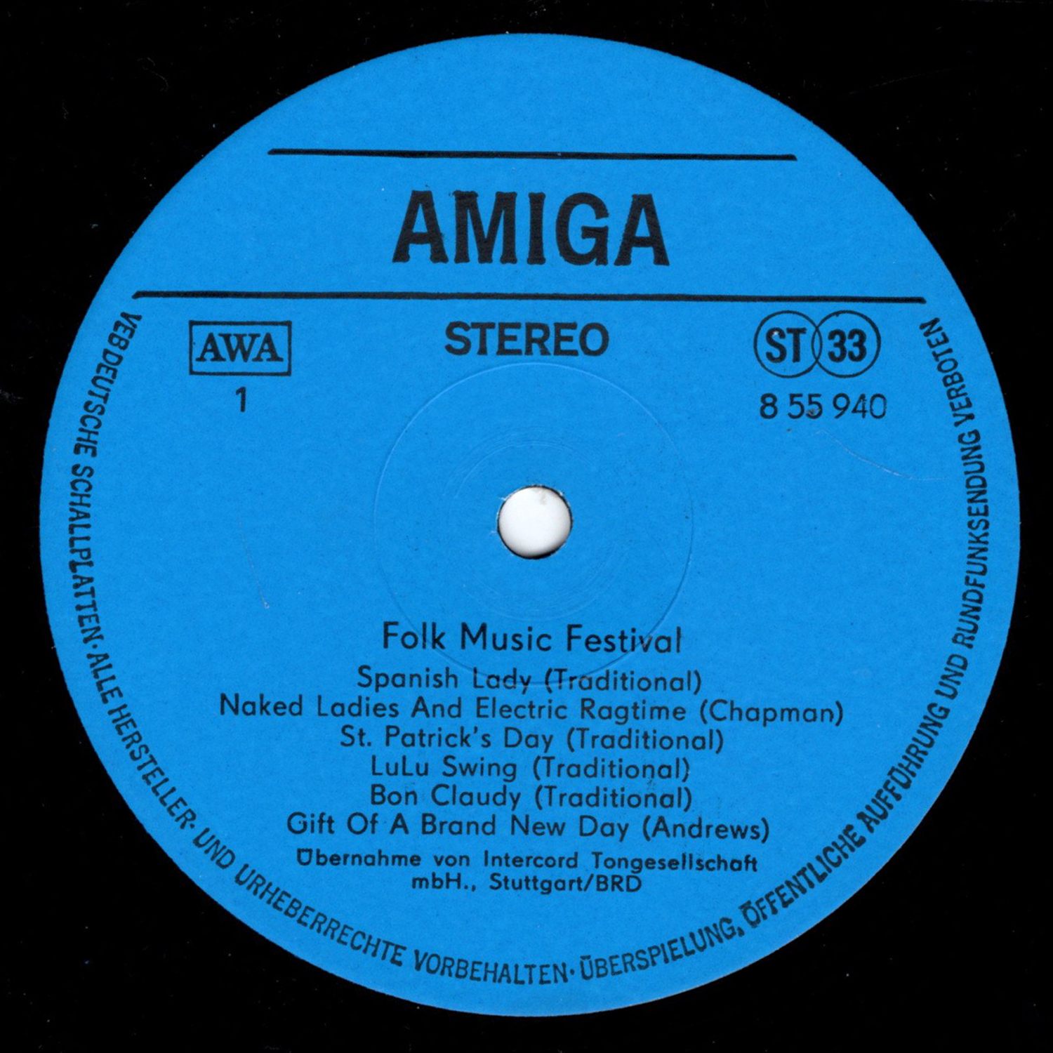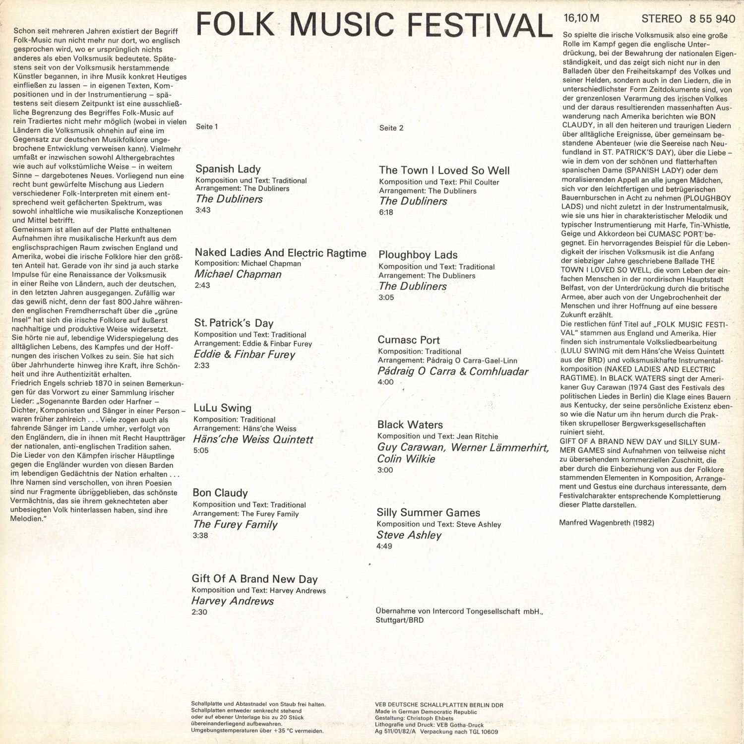 The remaining five titles on "FOLK MUSIC FESTIVAL" come from England and America. Here you will find instrumental folk song arrangements (LULU SWING with the Häns'che Weiss Quintet from Germany), and folk music-like instrumental compositions (NAKED LADIES AND ELECTRIC RAGTIME),. In BLACK WATERS sings the American Guy Carawan (1974 guest of the festival of political song in Berlin), the complaint of a farmer from Kentucky, who sees his personal existence as well as the nature around him ruined by the practices of unscrupulous mining companies.