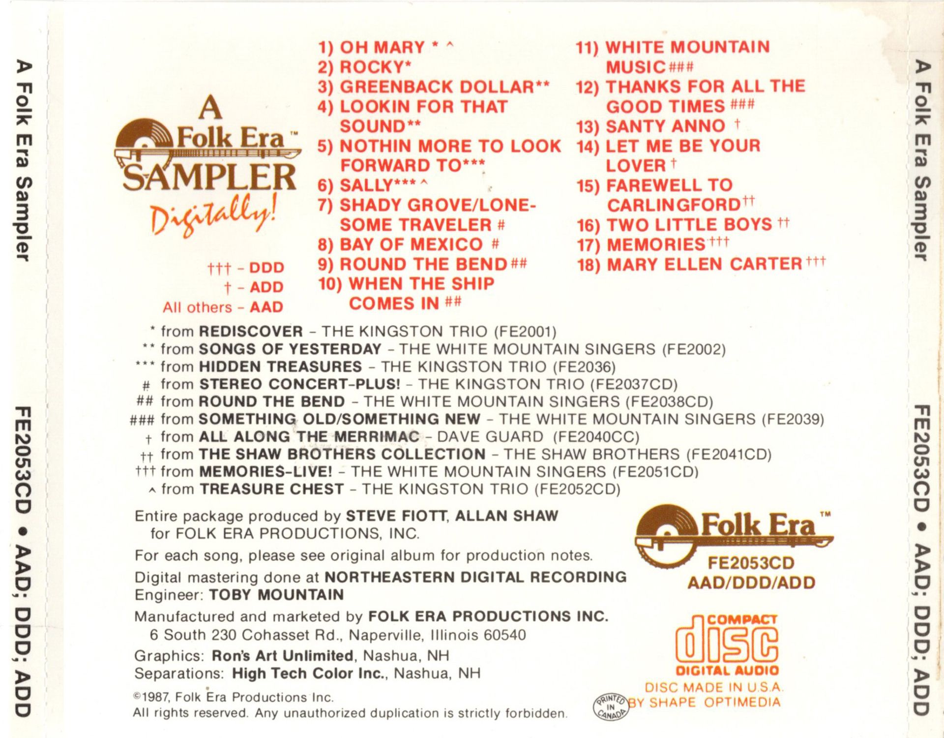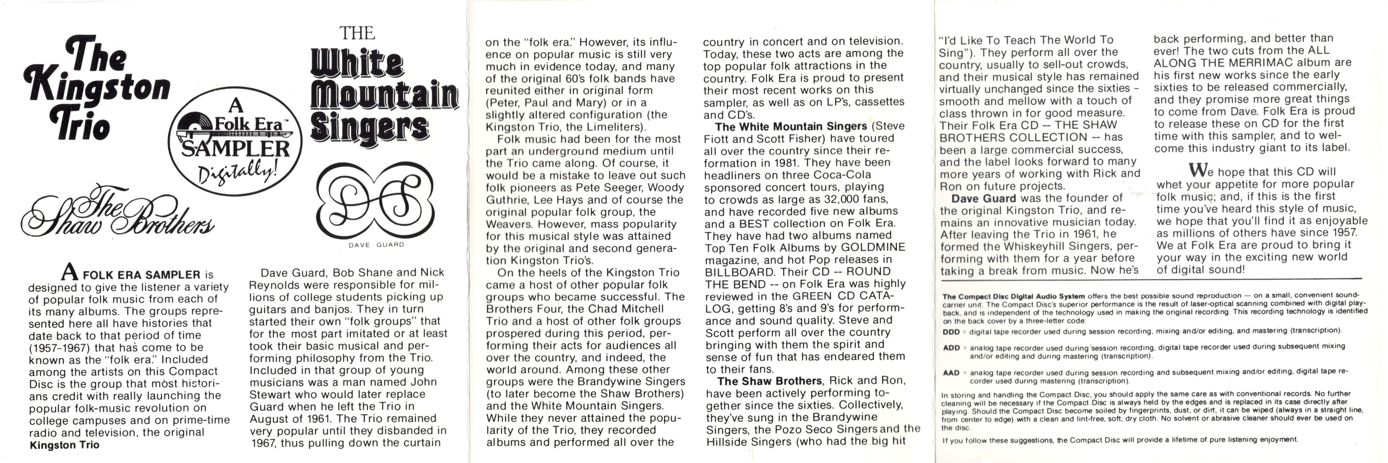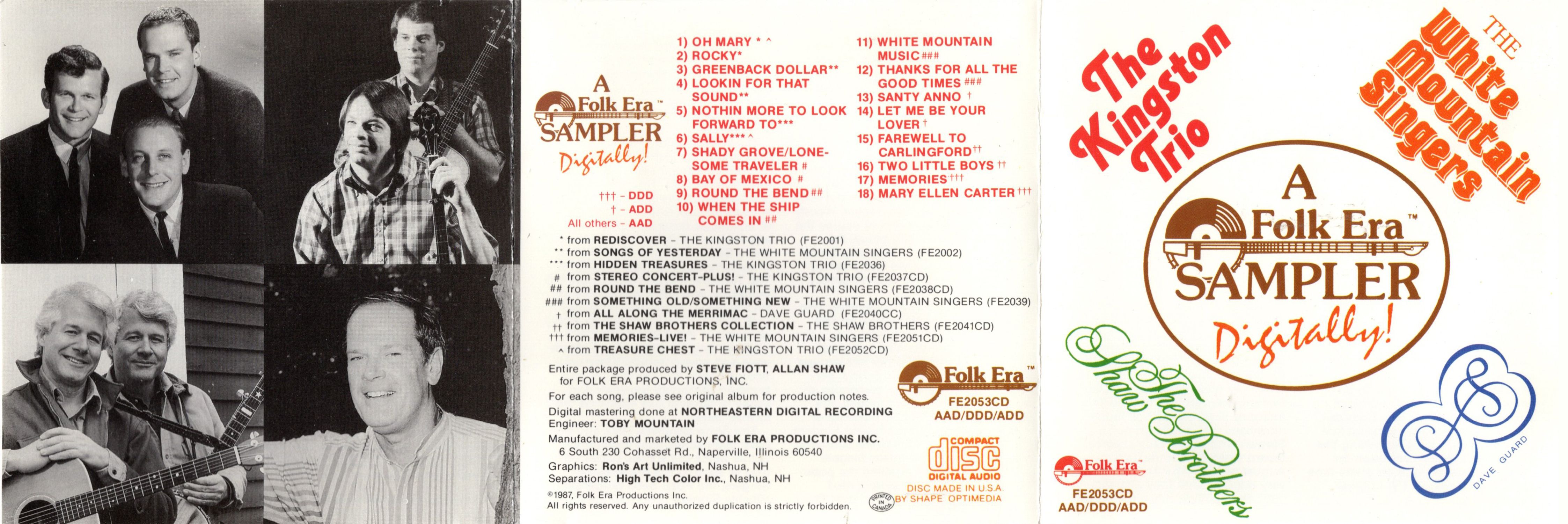 On the heels of the Kingston Trio came a host of other popular folk groups who became successful. The Brothers Four, the Chad Mitchell Trio and a host of other folk groups prospered during this period, performing their acts for audiences all over the country, and indeed, the world around. Among these other groups were the Brandywine Singers (to later become the Shaw Brothers) and the White Mountain Singers. While they never attained the popularity of the Trio, they recorded albums and performed all over the country in concert and on television. Today, these two acts are among the top popular folk attractions in the country. Folk Era is proud to present their most recent works on this sampler, as well as on LP's, cassettes and CD's.