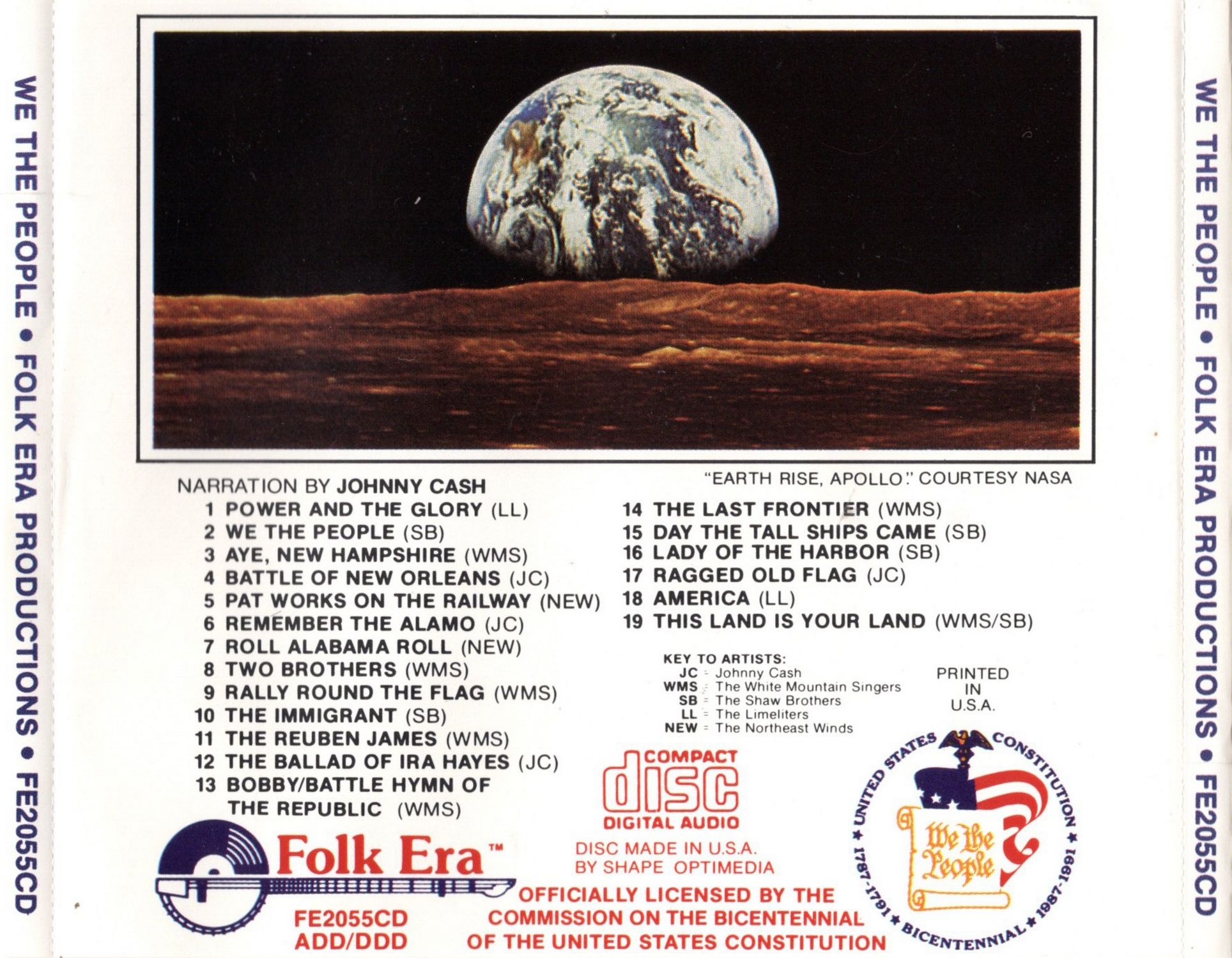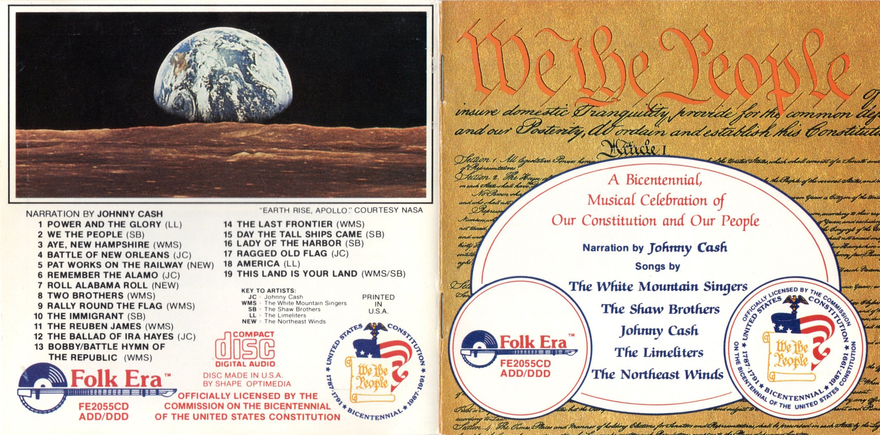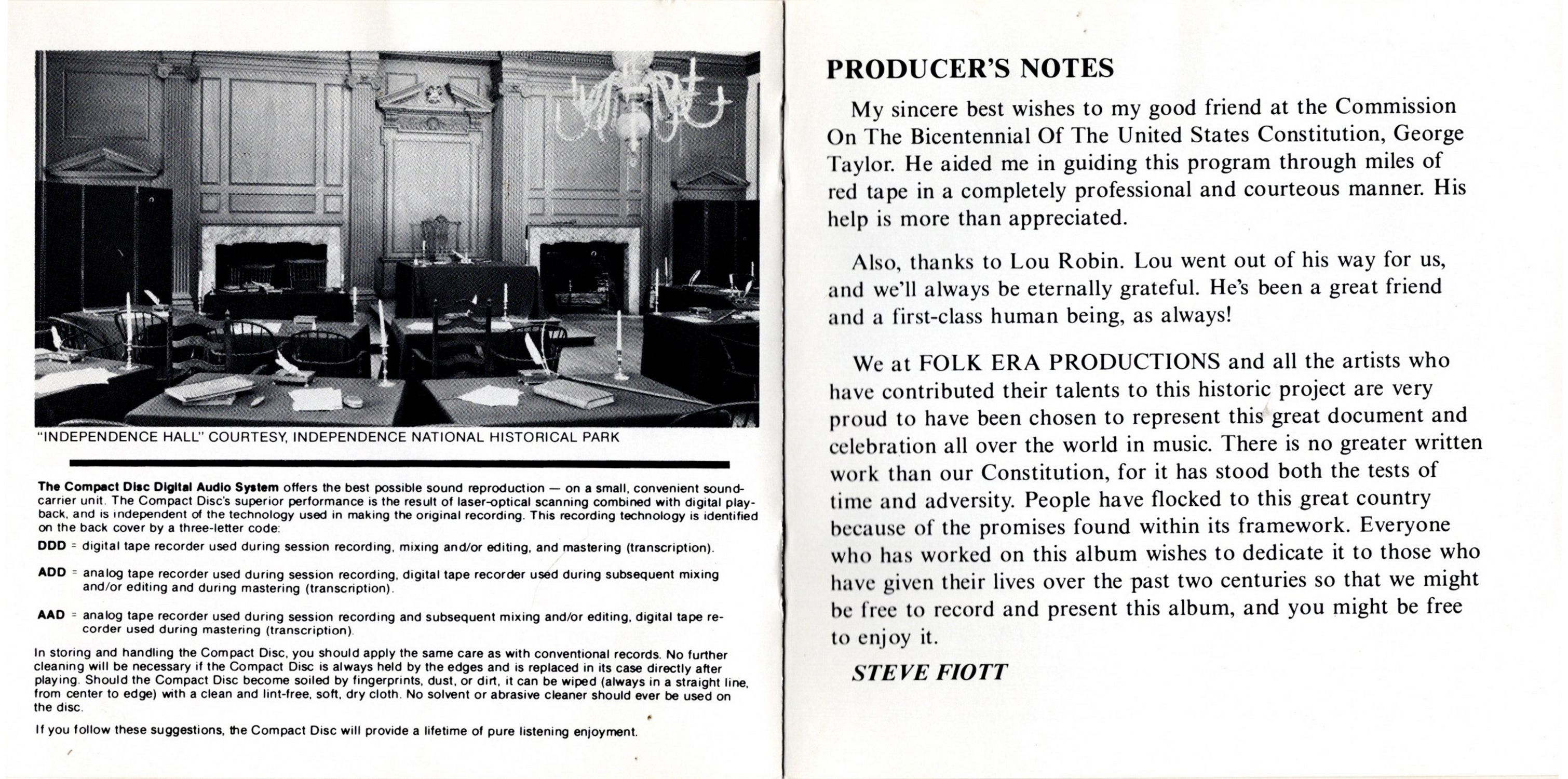 We at Folk Era Productions and all the artists who have contributed their talents to this historic project are very proud to have been chosen to represent this great document and celebration all over the world in music. There is no greater written work than our Constitution, for it has stood both the tests of time and adversity. People have flocked to this great country because of the promises found within its framework. Everyone who has worked on this album wishes to dedicate it to those who have given their lives over the past two centuries so that we might be free to record and present this album, and you might be free to enjoy it.