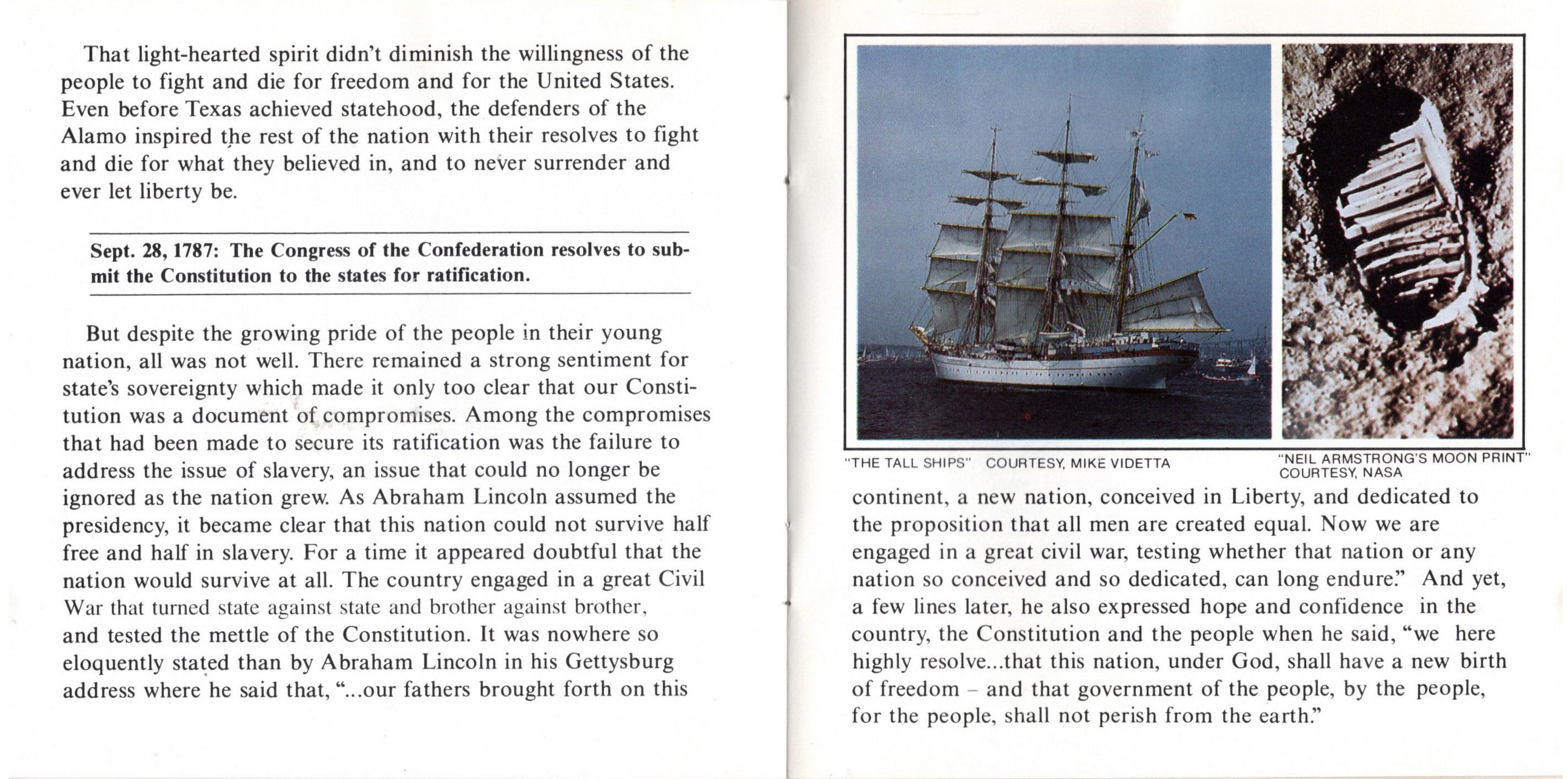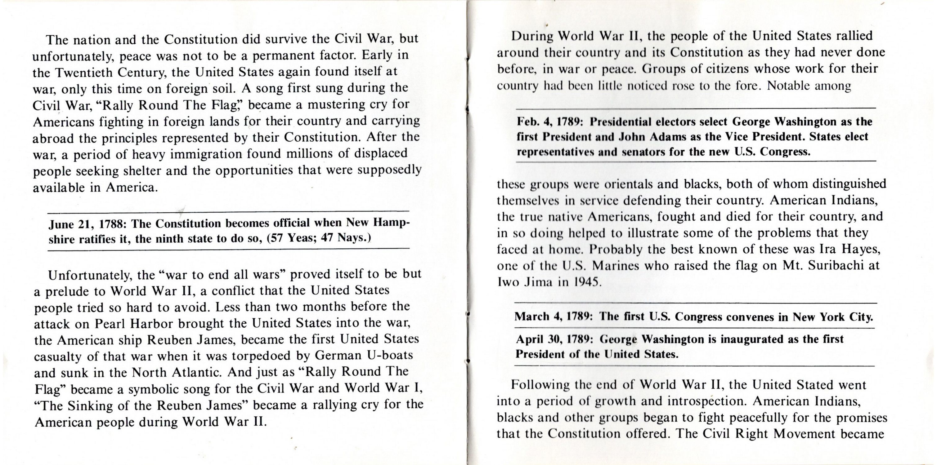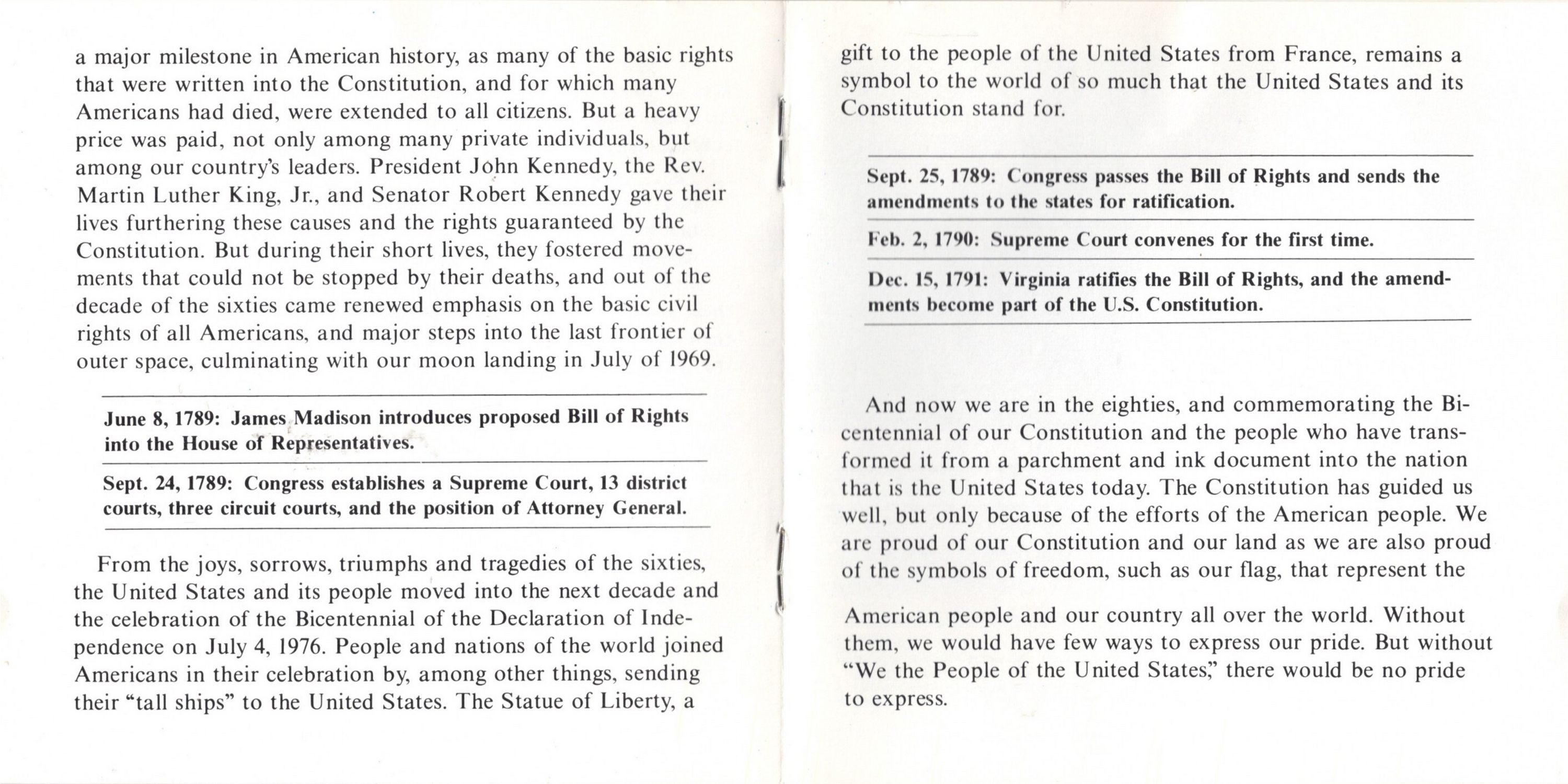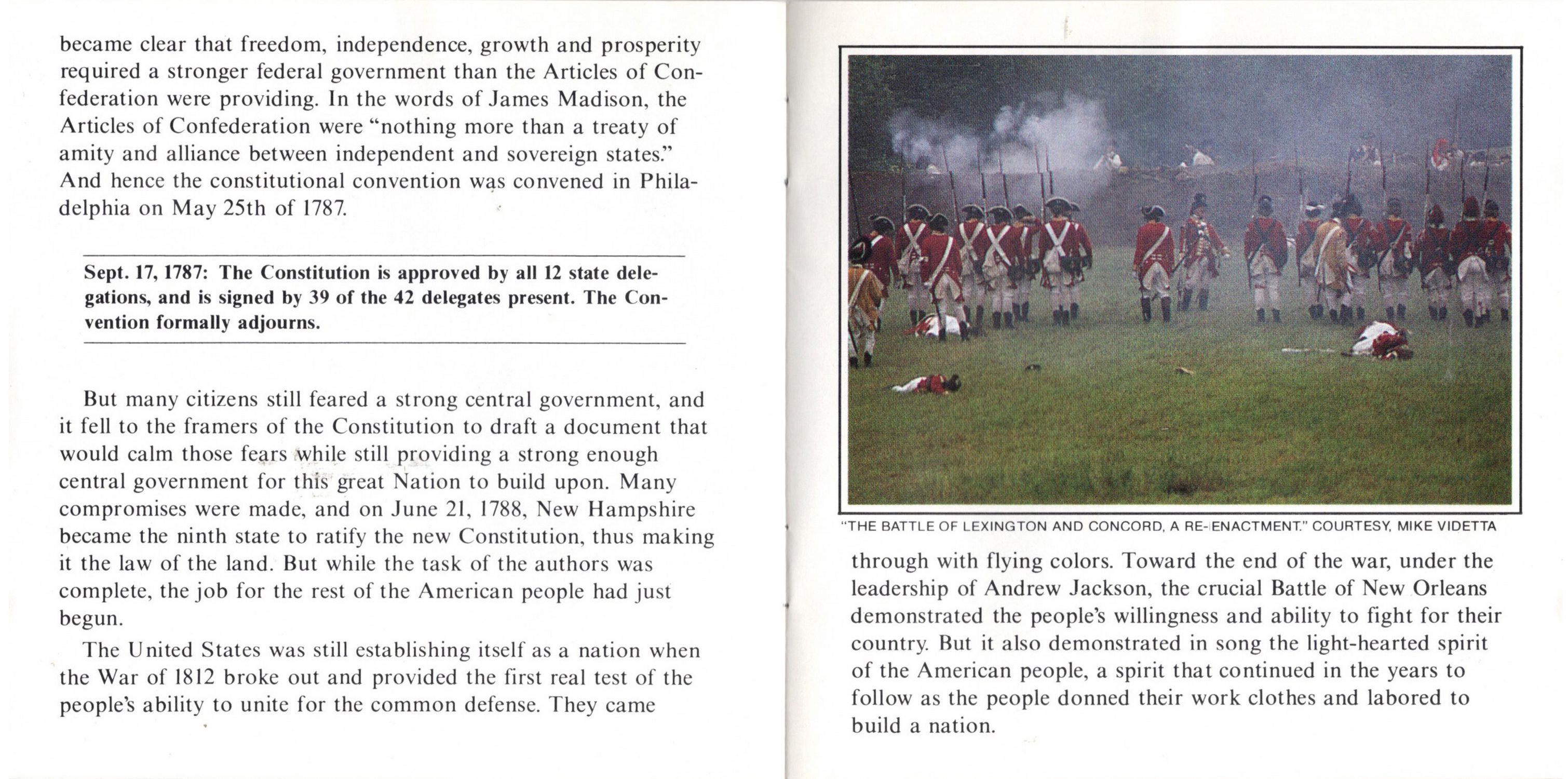 We at Folk Era Productions and all the artists who have contributed their talents to this historic project are very proud to have been chosen to represent this great document and celebration all over the world in music. There is no greater written work than our Constitution, for it has stood both the tests of time and adversity. People have flocked to this great country because of the promises found within its framework. Everyone who has worked on this album wishes to dedicate it to those who have given their lives over the past two centuries so that we might be free to record and present this album, and you might be free to enjoy it.