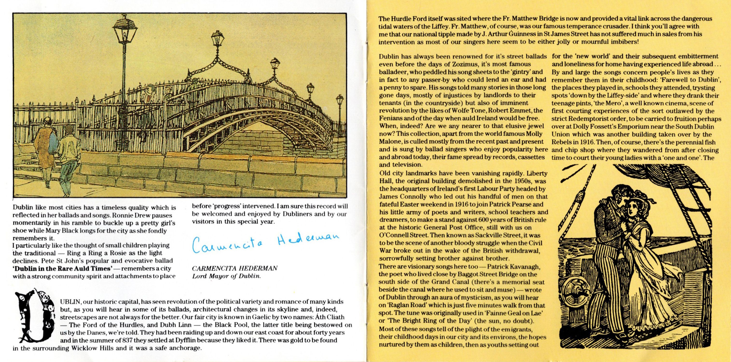 I particularly like the thought of small children playing the traditional — Ring a Ring a Rosie as the light declines. Pete St John's popular and evocative ballad 'Dublin in the Rare Auld Times' — remembers a city with a strong community spirit and attachments to place before 'progress' intervened. I am sure this record will be welcomed and enjoyed by Dubliners and by our visitors in this special year.