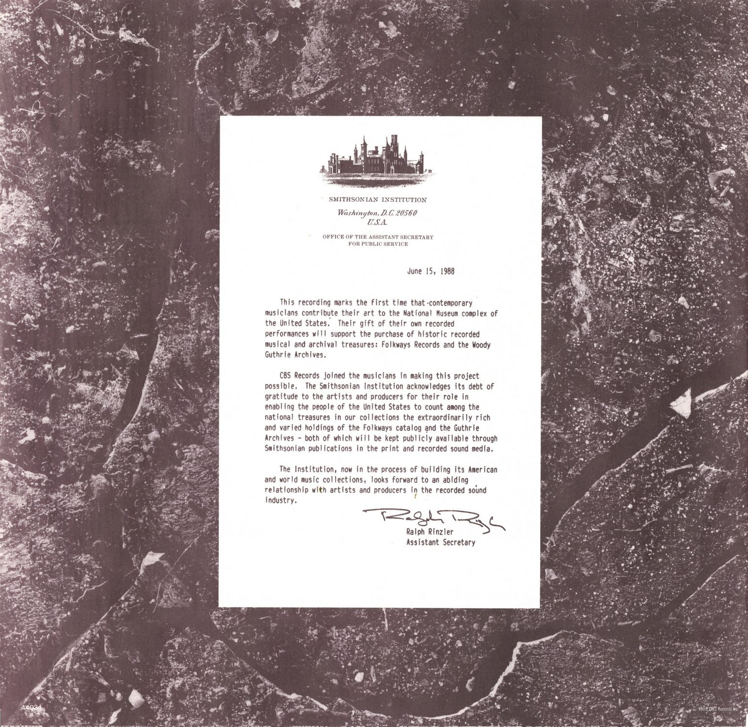 CBS Records joined the musicians in making this project possible. The Smithsonian Institution acknowledges its debt of gratitude to the artists and producers for their role in enabling the people of the United States to count among the national treasures in our collections the extraordinarily rich and varied holdings of the Folkways catalog and the Guthrie Archives - both of which will be kept publicly available through Smithsonian publications in the print and recorded sound media.
