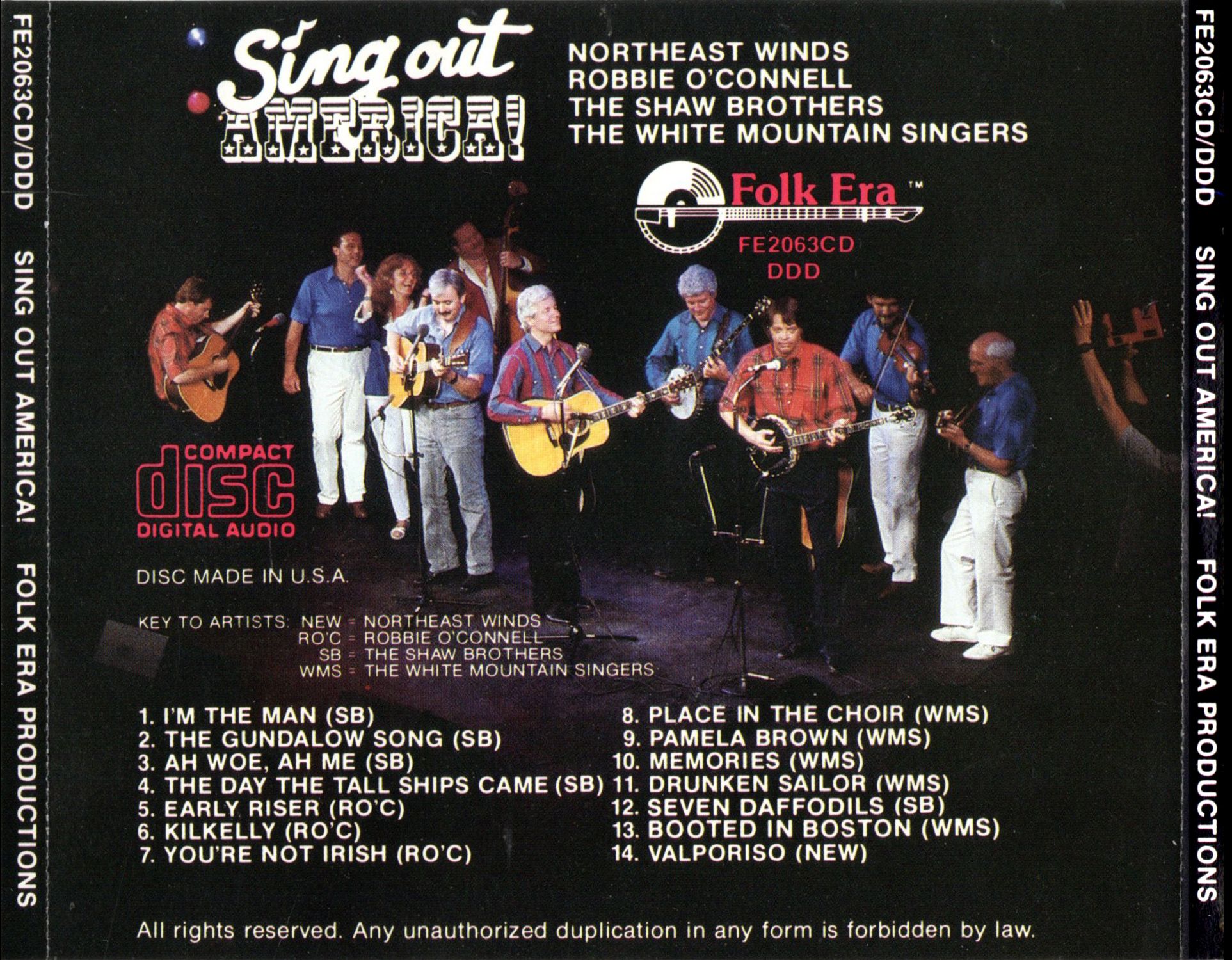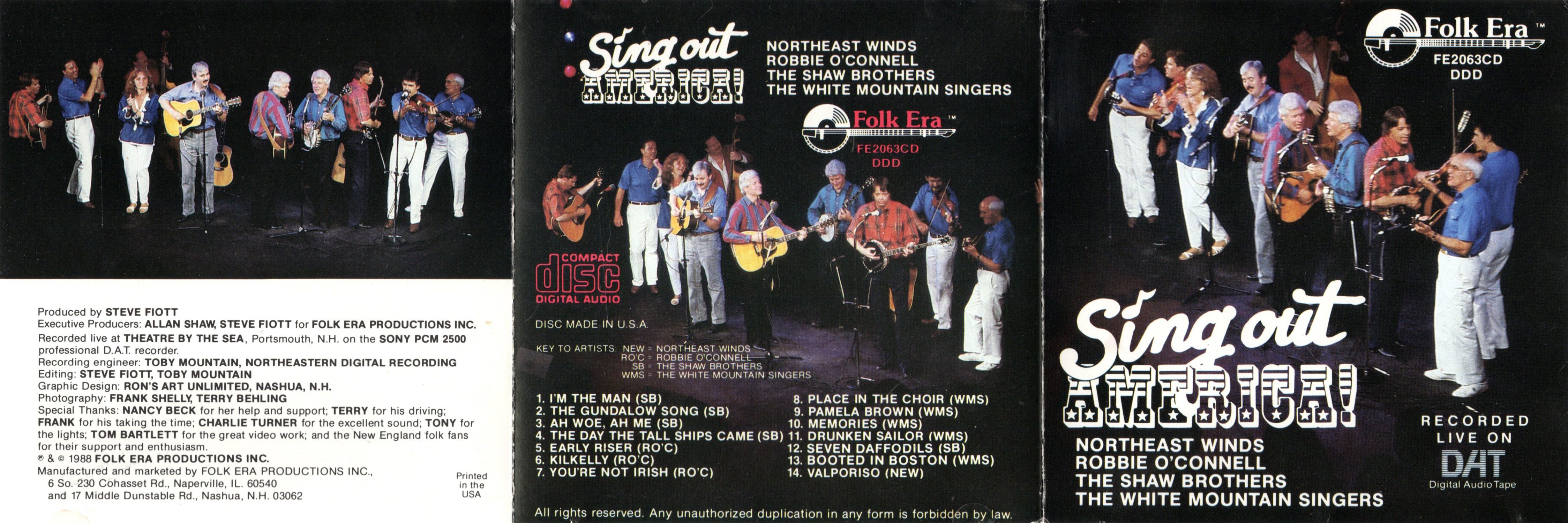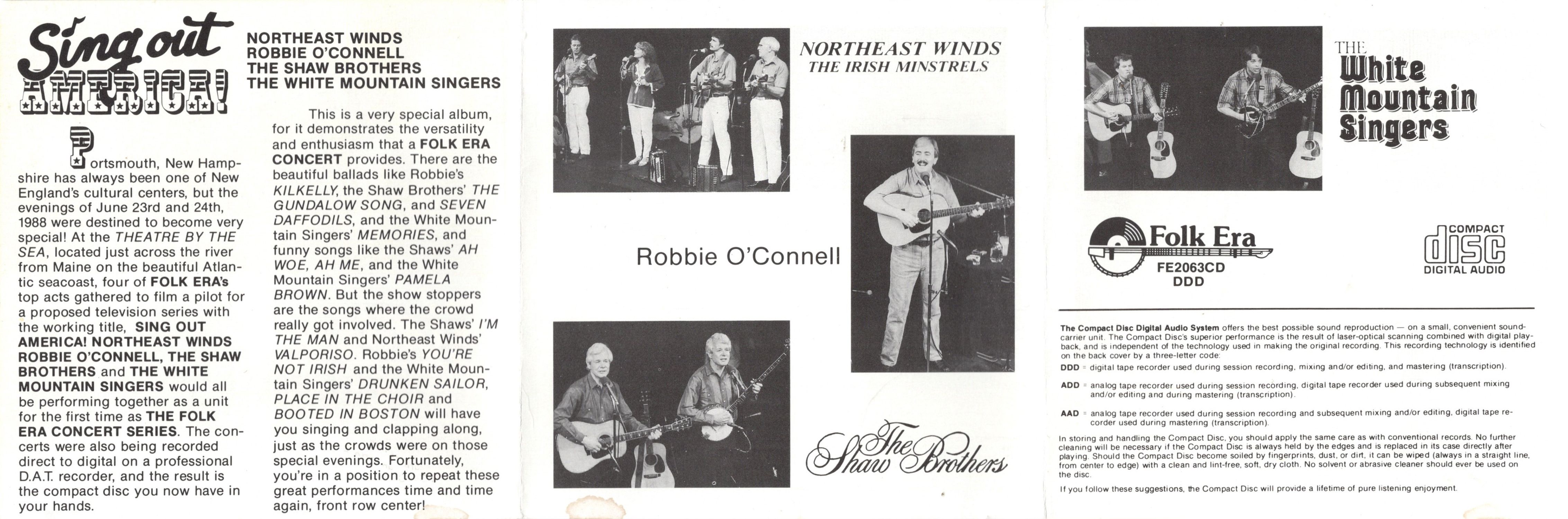 Portsmouth, New Hampshire has always been one of New England's cultural centers, but the evenings of June 23rd and 24th, 1988 were destined to become very special! At the Theatre By The Sea, located just across the river from Maine on the beautiful Atlantic seacoast, four of Folk Era's top acts gathered to film a pilot for a proposed television series with the working title, Sing Out America! Northeast Winds, Robbie O'connell, The Shaw Brothers and The White Mountain Singers would all be performing together as a unit for the first time as The Folk Era Concert Series. The concerts were also being recorded direct to digital on a professional D.A.T. recorder, and the result is the compact disc you now have in your hands.