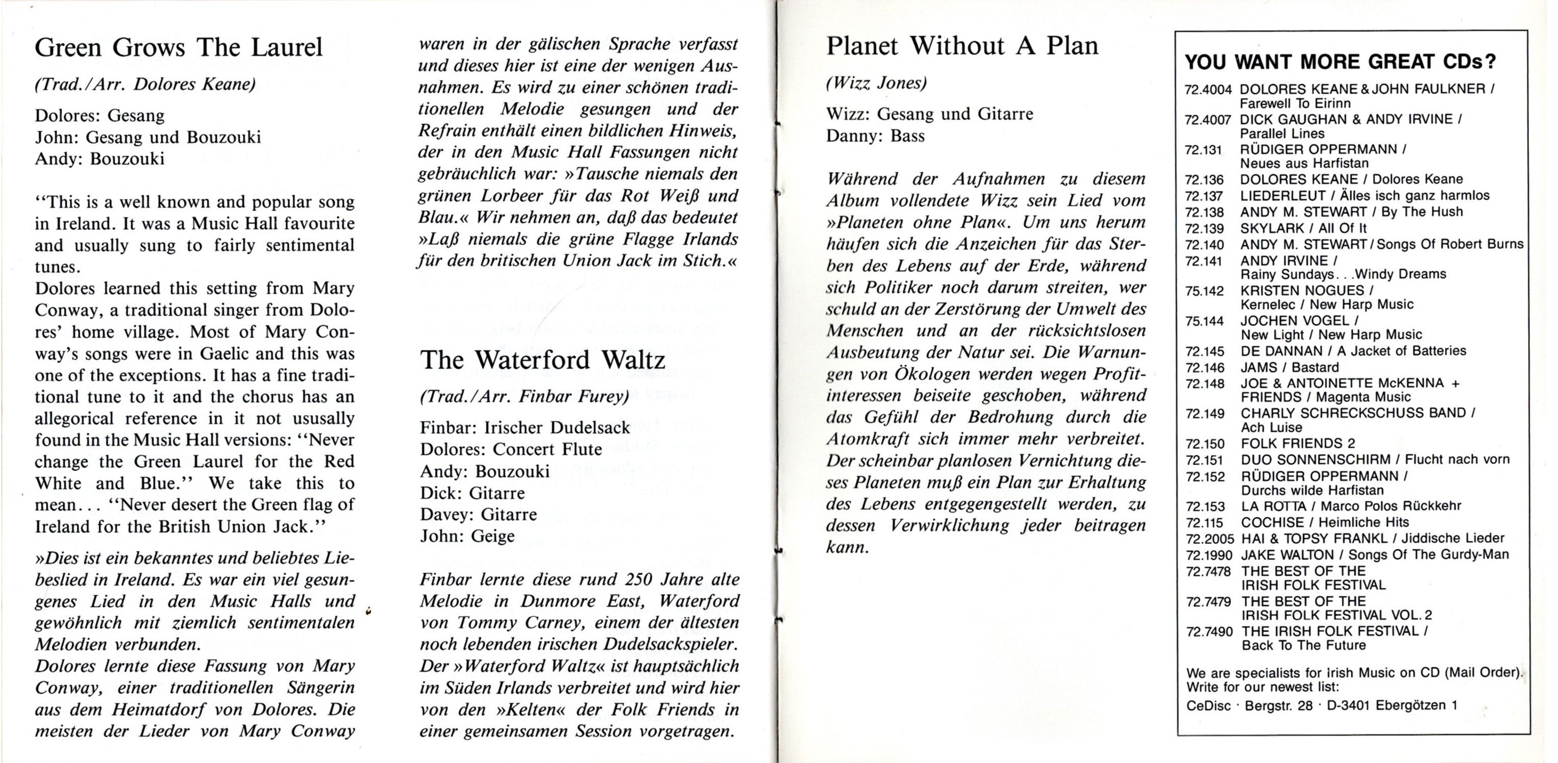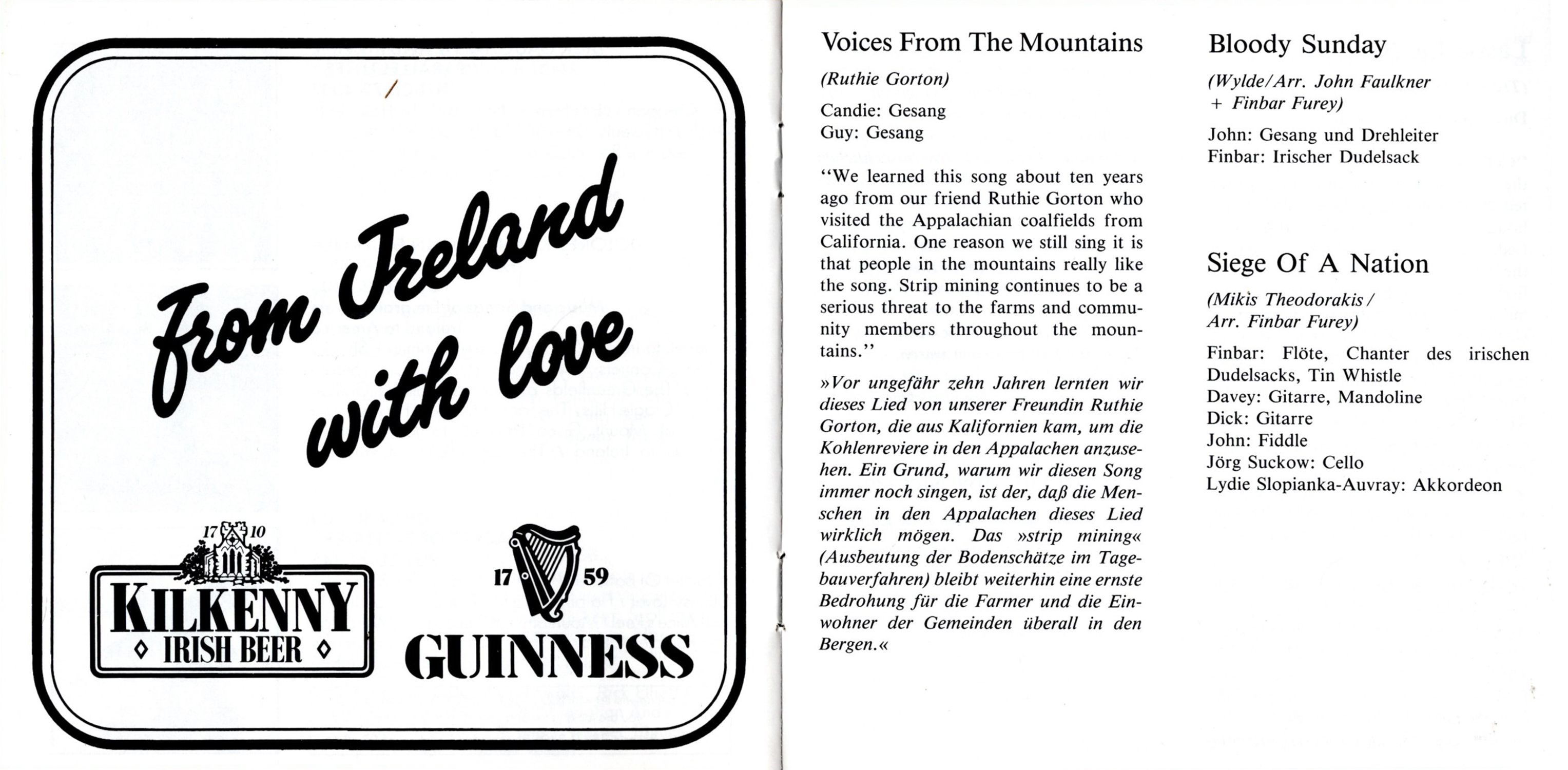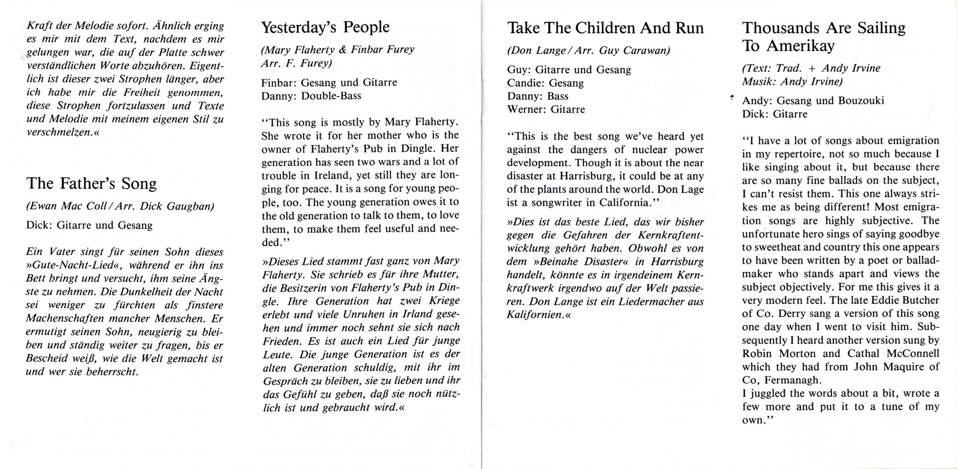 Yesterday's People — "This song is mostly by Mary Flaherty. She wrote it for her mother who is the owner of Flaherty's Pub in Dingle. Her generation has seen two wars and a lot of trouble in Ireland, yet still they are longing for peace. It's a song for young people, too. The young generation owes it to the old generation to talk to them, to love them, to make them feel useful and needed."