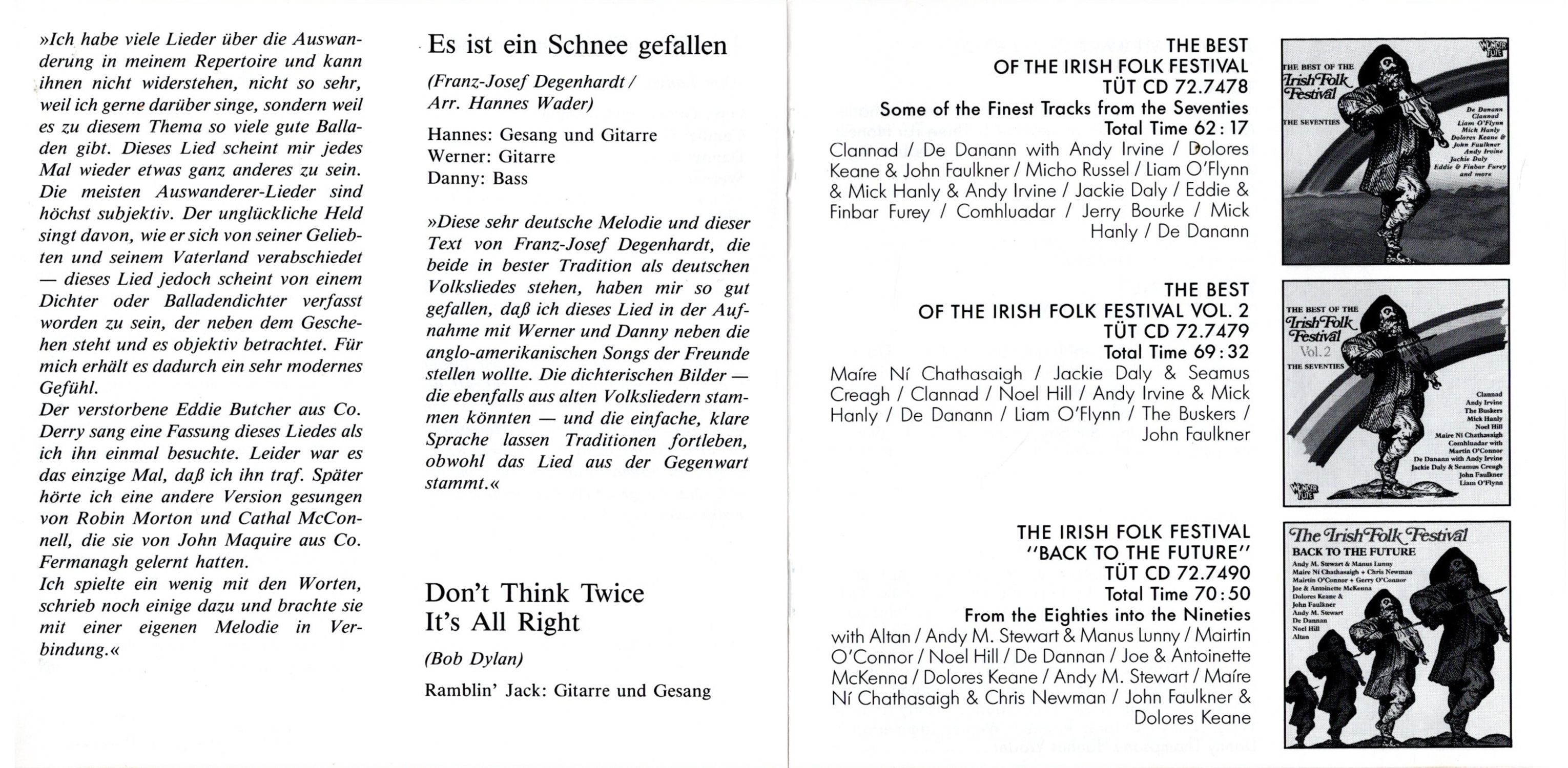 Es Ist Ein Schnee Gefallen — I liked this very German melody and this text by Franz-Josef Degenhardt, both of which are in the best tradition of German folk songs, so much that I put this song next to the friends' Anglo-American songs in the recording with Werner and Danny wanted. The poetic images - which could also come from old folk songs - and the simple, clear language allow traditions to live on, even though the song comes from the present.