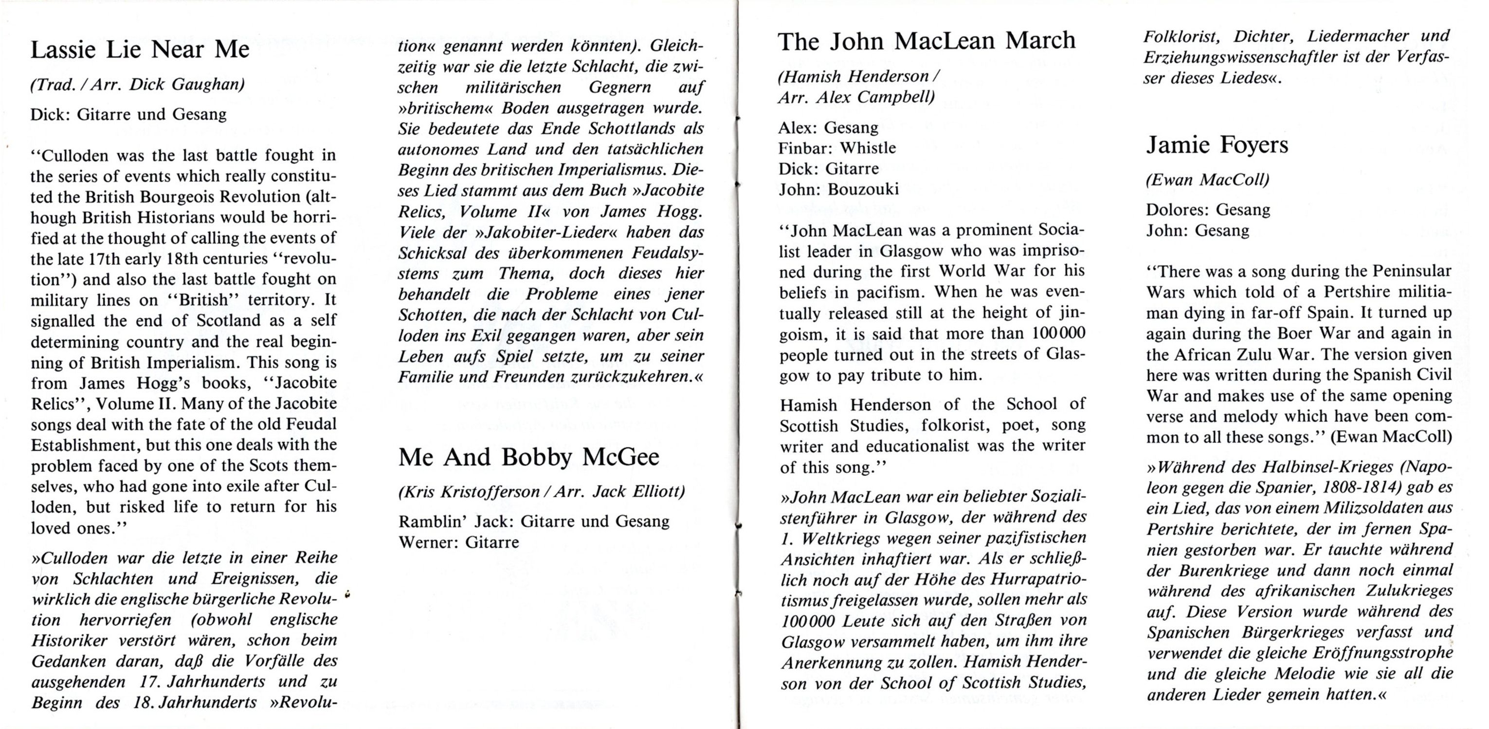 The John MacLean March — "John MacLean was a prominent socialist leader in Glasgow who was imprisoned during the first World War for his beliefs in pacifism. When he was eventually released still at the height of jingoism, it is said that more than 100,000 people turned out in the streets of Glasgow to pay tribute to him. Hamish Henderson of the School of Scottish Studies, folkorist, poet, song writer and educationalist was the writer of this song."