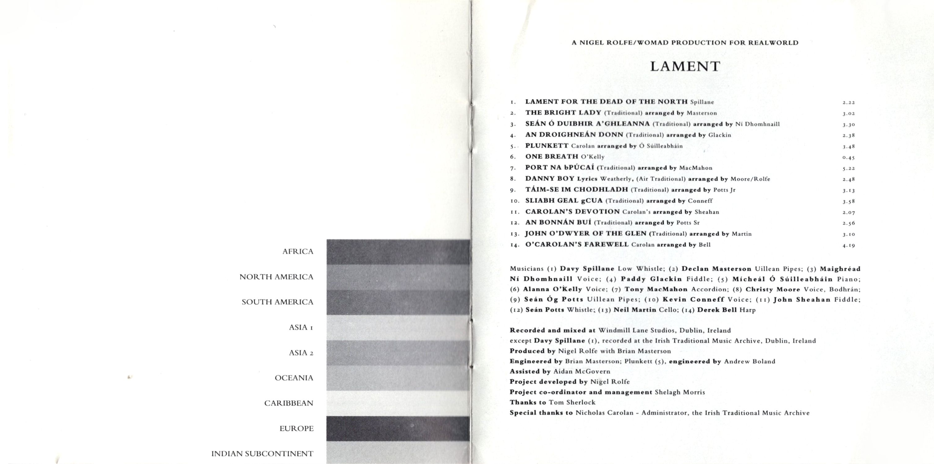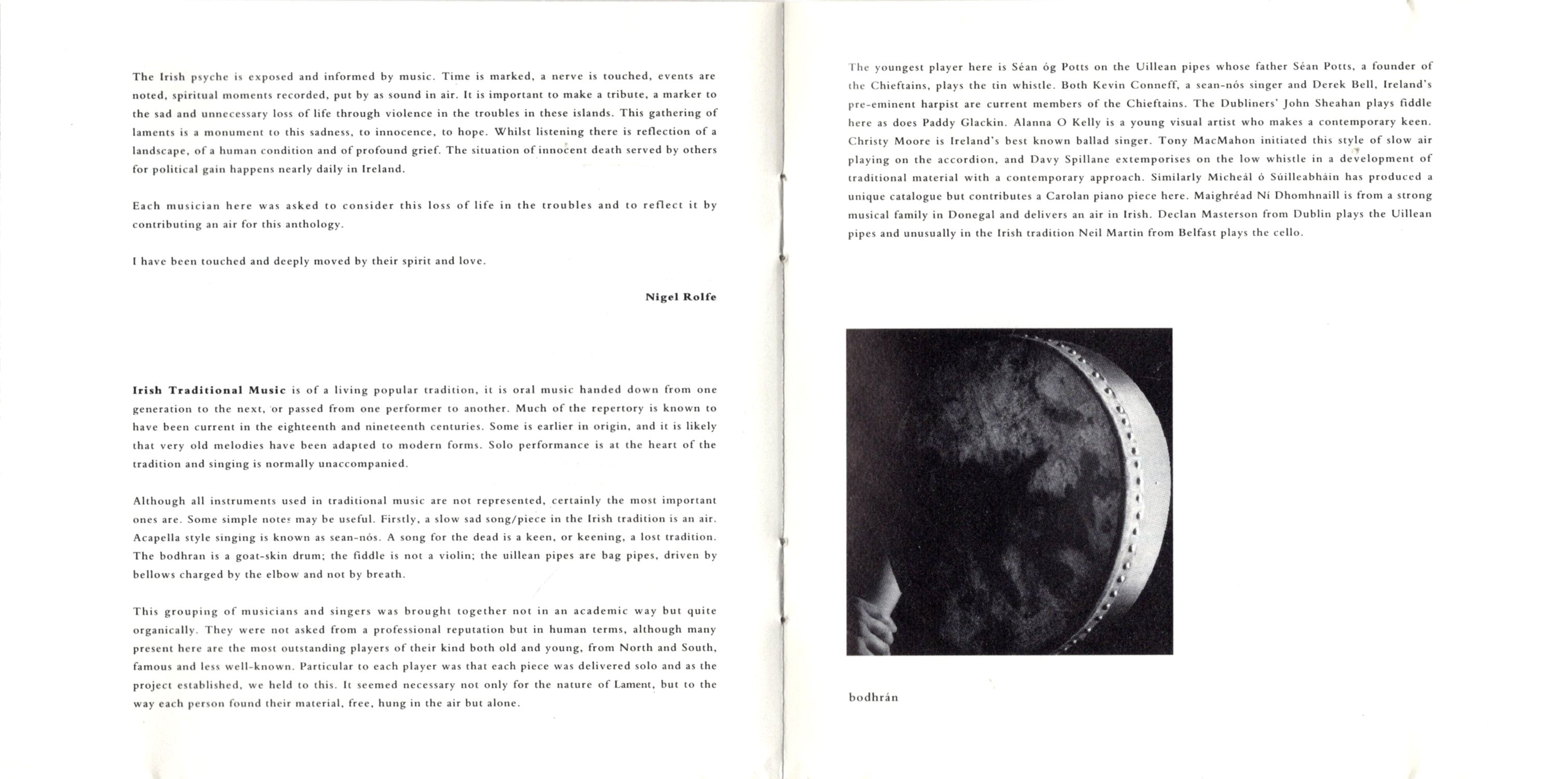 This grouping of musicians and singers was brought together not in an academic way but quite organically. They were not asked from a professional reputation but in human terms, although many present here arc the most outstanding players of their kind both old and young, from North and South, famous and less well-known. Particular to each player was that each piece was delivered solo and as the project established, we held to this. It seemed necessary not only for the nature of Lament, but to the way each person found their material, free, hung in the air hut alone.