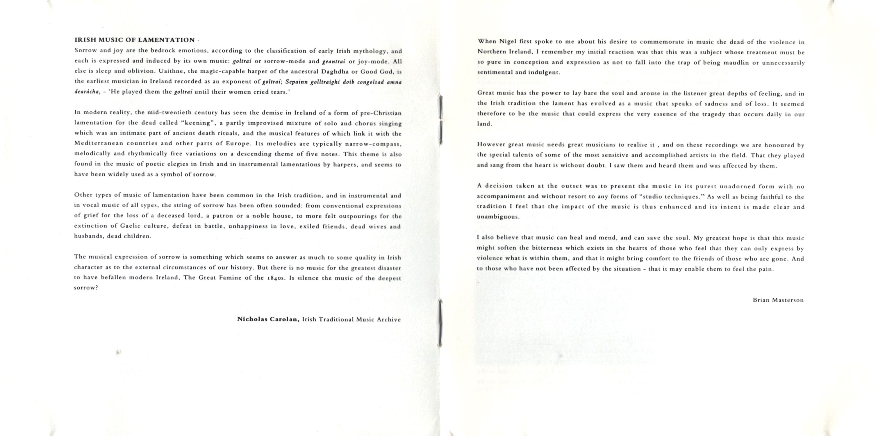 Great music has the power to lay bare the soul and arouse in the listener great depths of feeling, and in the Irish tradition the lament has evolved as a music that speaks of sadness and of loss. It seemed therefore to be the music that could express the very essence of the tragedy that occurs daily in our land.