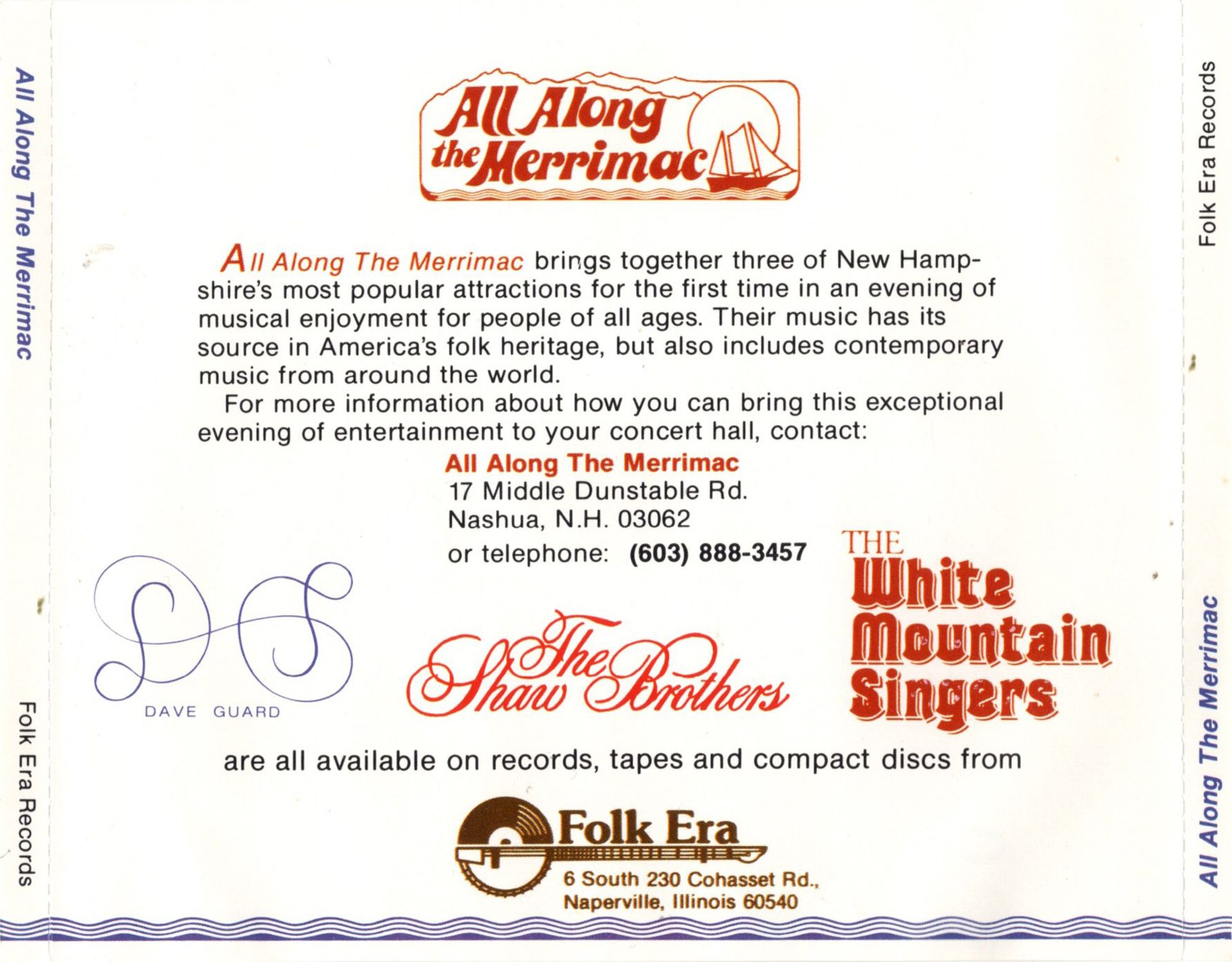 It isn't a rare sight to find Sold Out signs at their concerts from New Hampshire to Oregon and all stops in between. For the past two years, Coca-Cola has sponsored two extremely successful tours by the group with audiences as large as 32,000 people. A quote from a recent article in the Kingston Korner Newsletter says it all. "What I feel is most important in this recent Folk Revival are the new songs, and at the fore of this material are THE WHITE MOUNTAIN SINGERS, they were just sensational!!" Steve, Scott and their bass player, Bob Smiley, are proud of their successes, and are grateful to people everywhere who have given them their support.