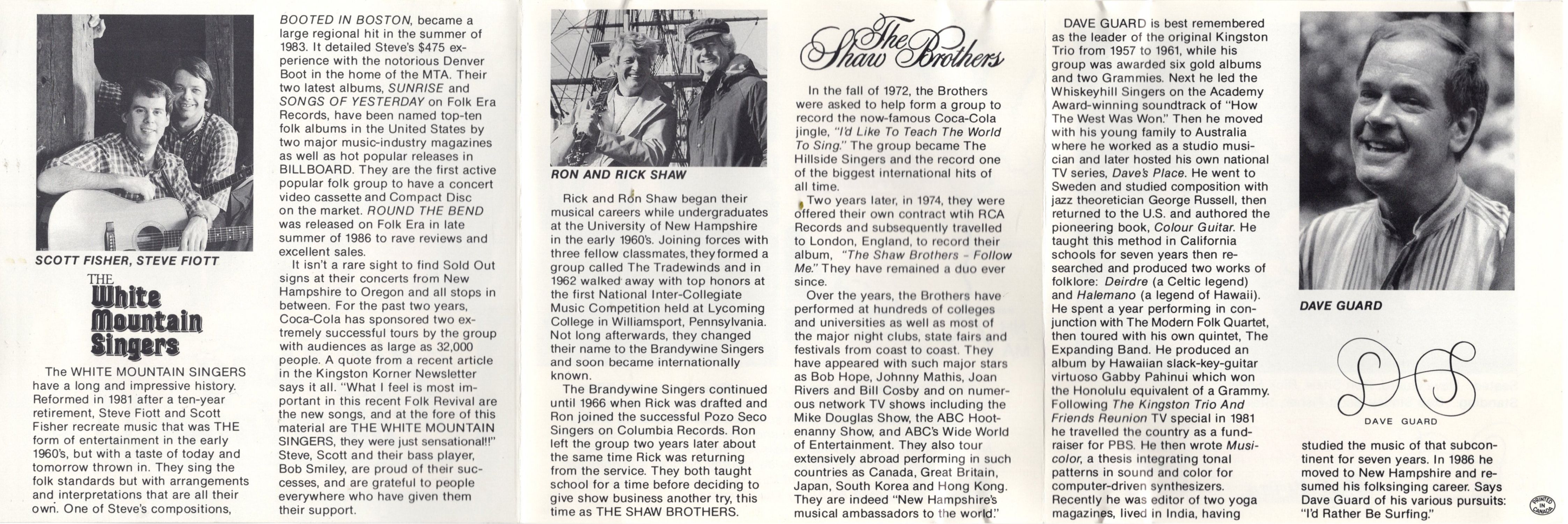 The WHITE MOUNTAIN SINGERS have a long and impressive history. Reformed in 1981 after a ten-year retirement, Steve Fiott and Scott Fisher recreate music that was THE form of entertainment in the early 1960's, but with a taste of today and tomorrow thrown in. They sing the folk standards but with arrangements and interpretations that are all their own. One of Steve's compositions, BOOTED IN BOSTON became a large regional hit in the summer of 1983. It detailed Steve's $475 experience with the notorious Denver Boot in the home of the MTA. Their two latest albums, SUNRISE and SONGS OF YESTERDAY on Folk Era Records, have been named top-ten folk albums in the United States by two major music-industry magazines as well as hot popular releases in BILLBOARD. They are the first active popular folk group to have a concert video cassette and Compact Disc on the market. ROUND THE BEND was released on Folk Era in late summer of 1986 to rave reviews and excellent sales.
