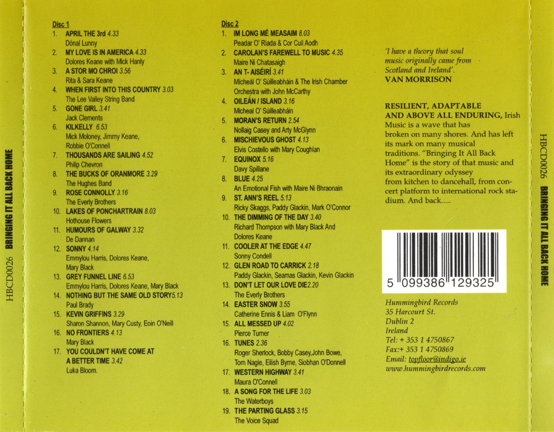 RESILIENT, ADAPTABLE AND ABOVE ALL ENDURING, Irish Music is a wave that has broken on many shores. And has left its mark on many musical traditions. "Bringing It All Back Home" is the story of that music and its extraordinary odyssey from kitchen to dancehall, from concert platform to international rock stadium. And back …