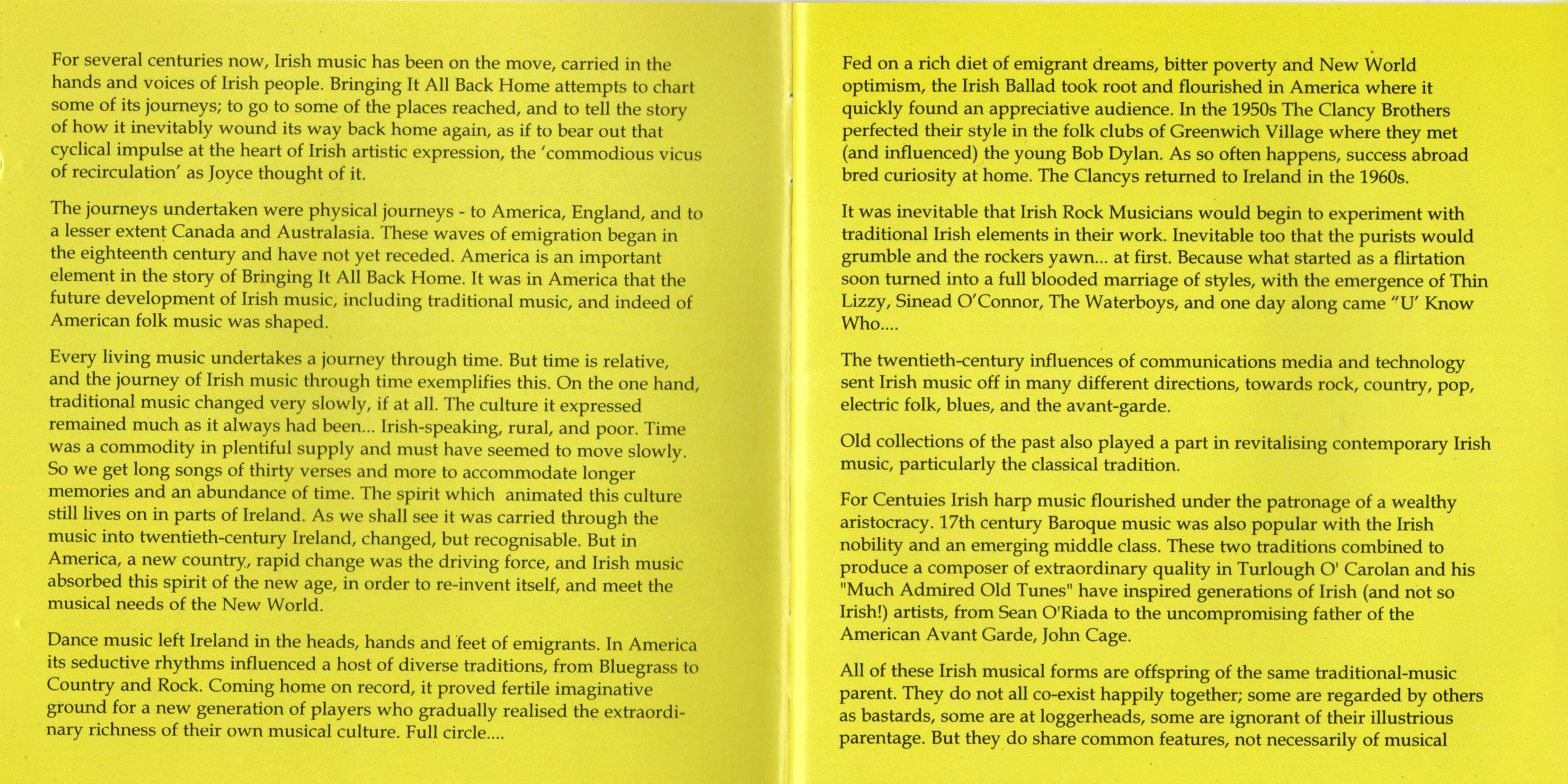 Music returned to Ireland in many guises at different times, re-invigorating the tradition when it most needed it, Bringing It All Back Home — to the source and sensibility from which it had sprung.