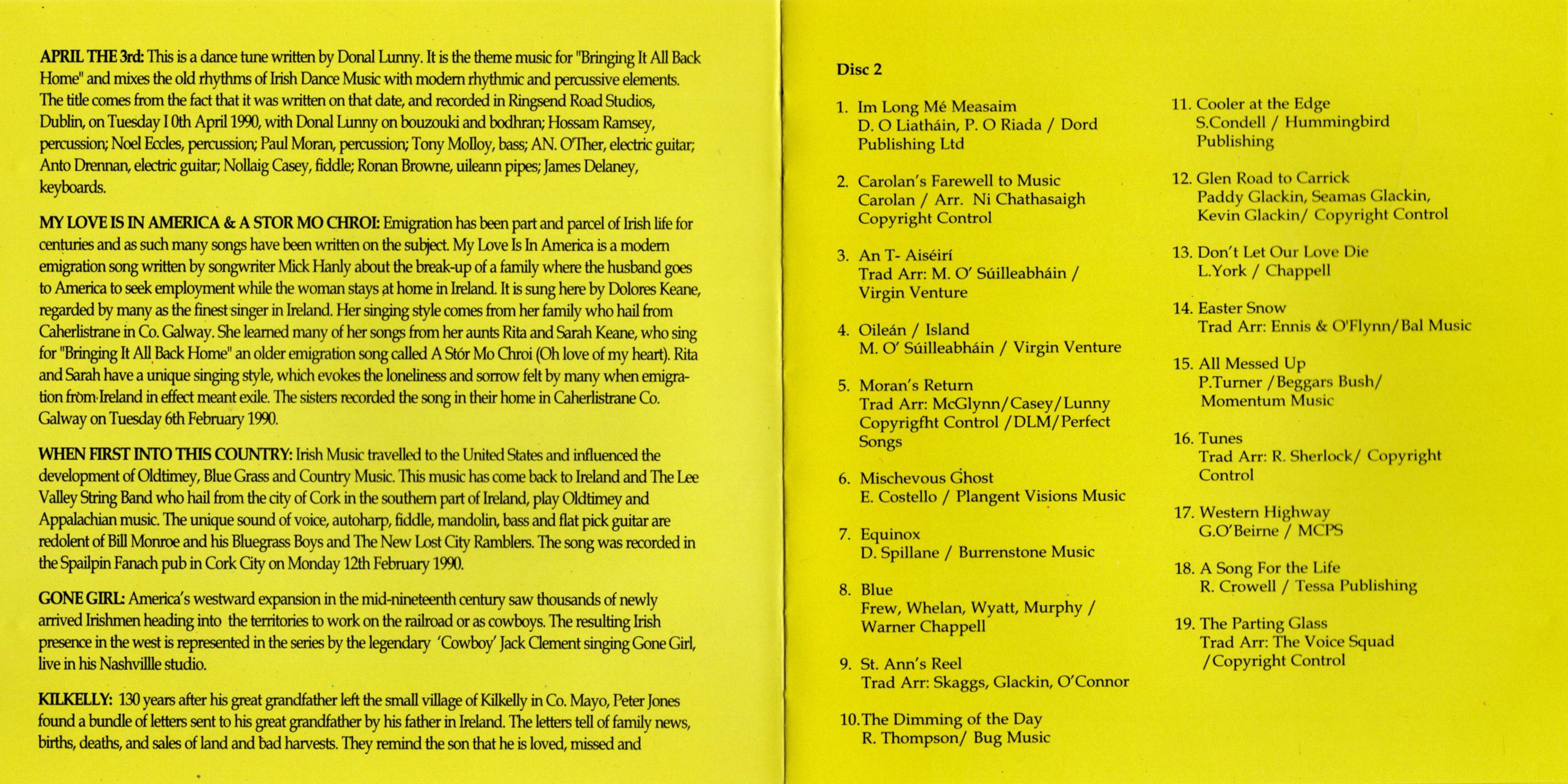 APRIL THE 3rd: This is a new dance tune written by Dónal Lunny. It is the theme music for "Bringing It All Back Home" and mixes the old rhythms of Irish Dance Music with modern rhythmic and percussive elements. The title comes from the fact that it was written on that date, and recorded in Ringsend Road Studios, Dublin, on Tuesday 10th April 1990, with Dónal Lunny on bouzouki and bodhran; Hossam Ramsey, percussion; Noel Eccles, percussion; Paul Moran, percussion; Tony Molloy, bass; A.N. O'Ther, electric guitar; Anto Drennan, electric guitar, Nollaig Casey, fiddle; Ronan Browne, uileann pipes; James Delaney, keyboards.